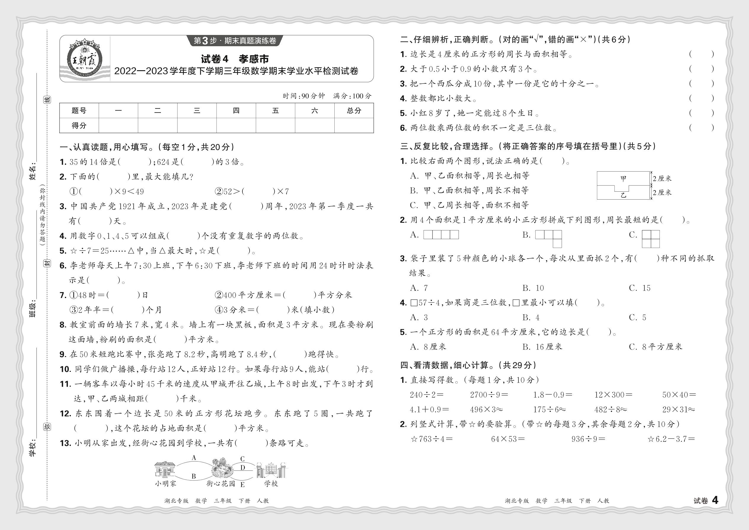 湖北省孝感市2022—2023学年度下学期三年级数学期末学业水平检测试卷(人教版)【4】