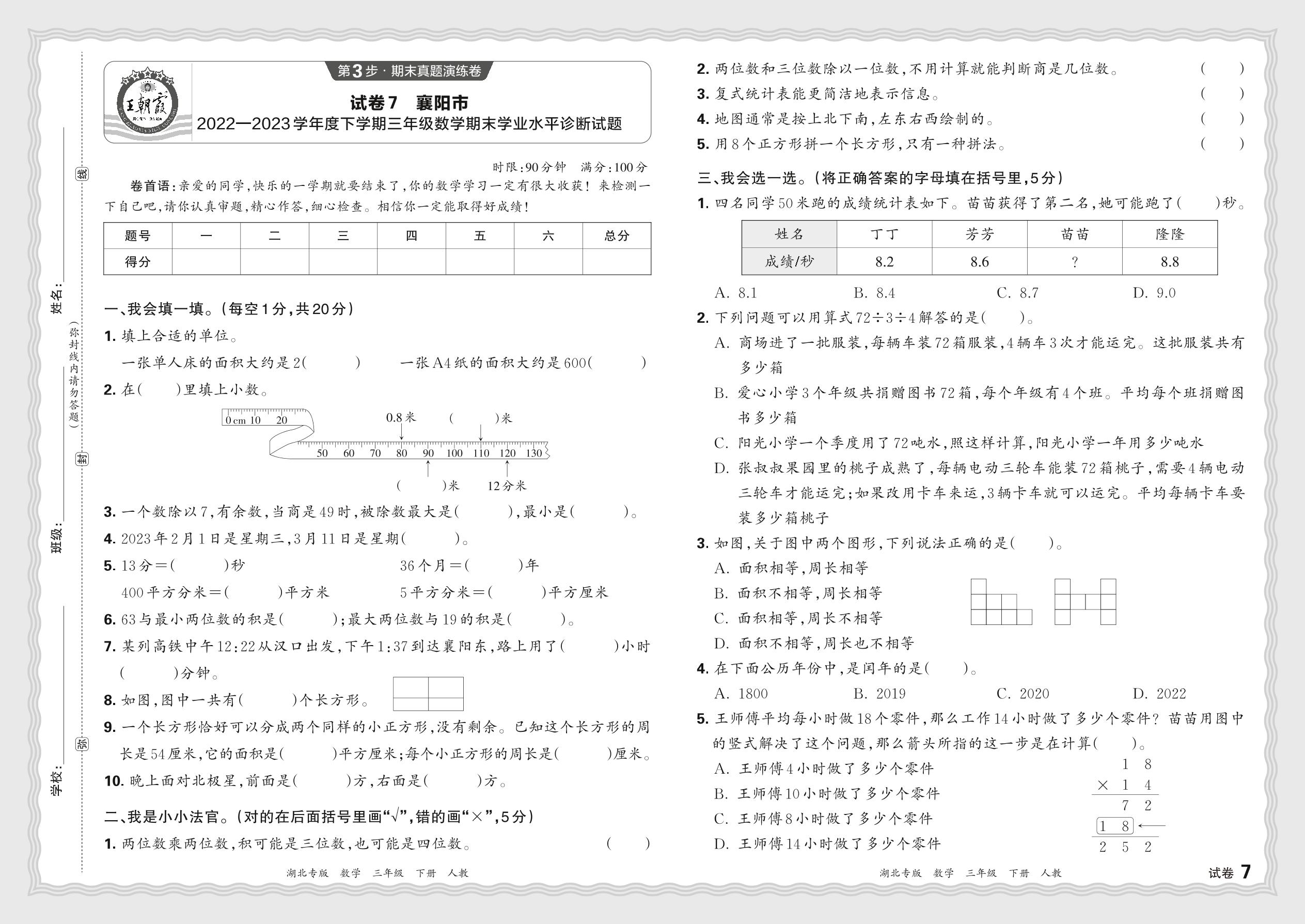湖北省襄阳市2022—2023学年度下学期三年级数学期末学业水平诊断试题(人教版)【7】