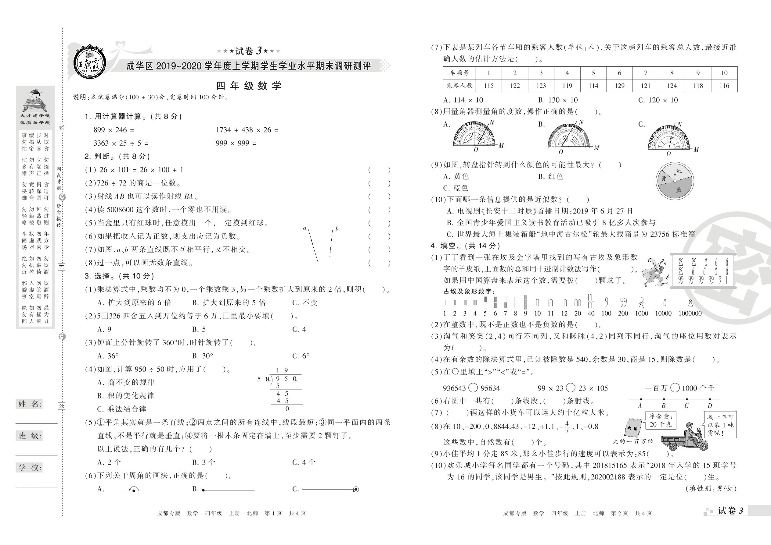 2019-2020学年第一学期成都市成华区四年级数学试卷(北师版)【3】