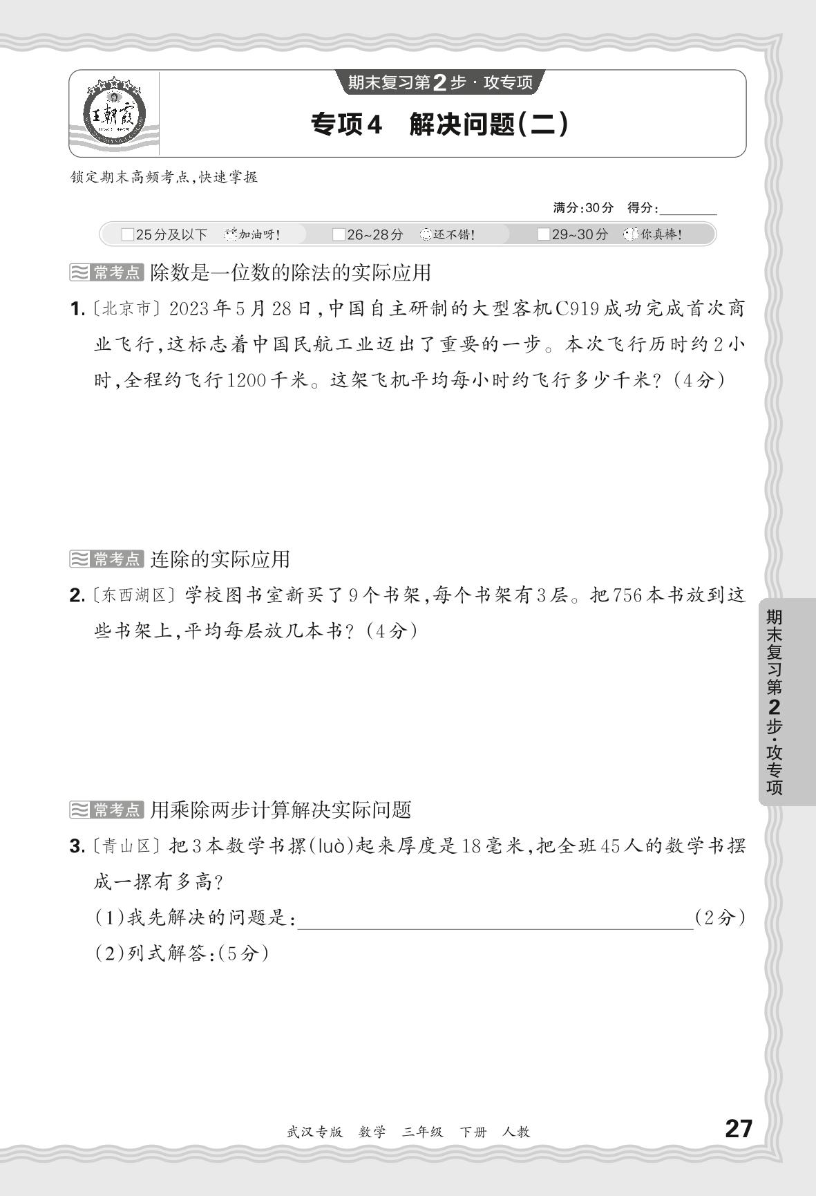 2024春下册三年级数学人教版 期末专项卷武汉版·解决问题(二)【4】