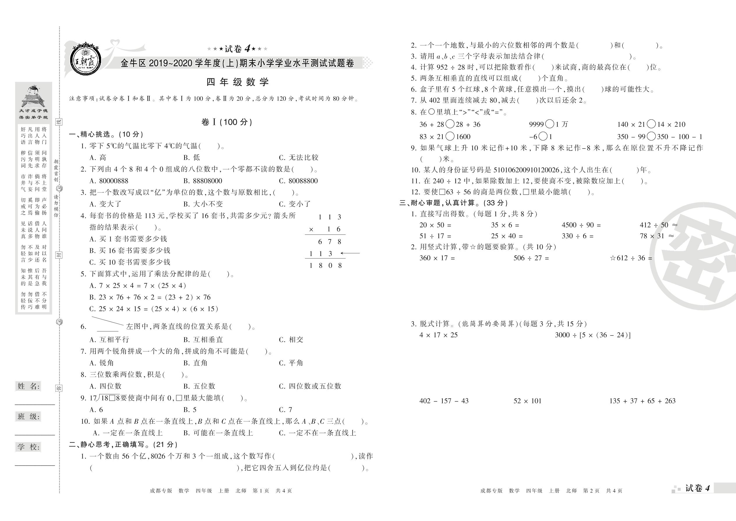 2019-2020学年第一学期成都市金牛区四年级数学试卷(北师版)【4】