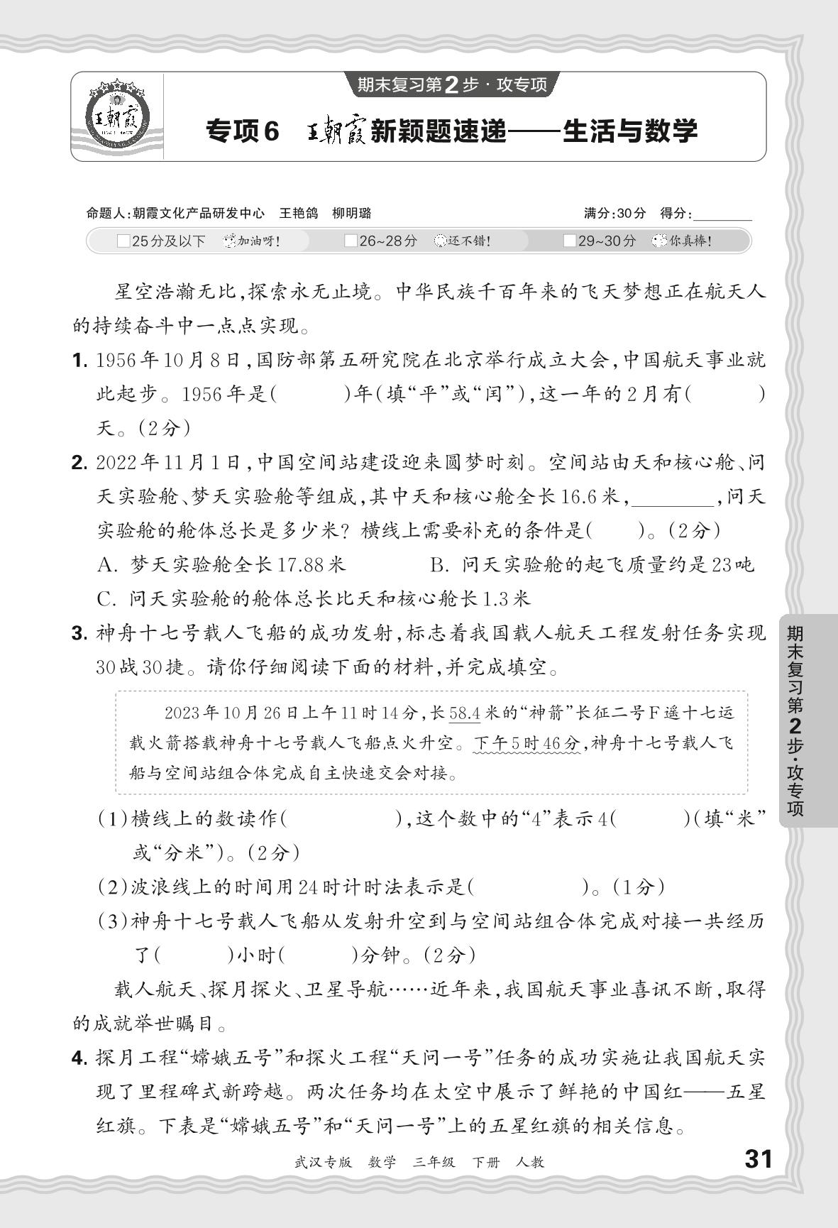 2024春下册三年级数学人教版 期末专项卷武汉版·王朝霞新颖题速递——生活与数学【6】
