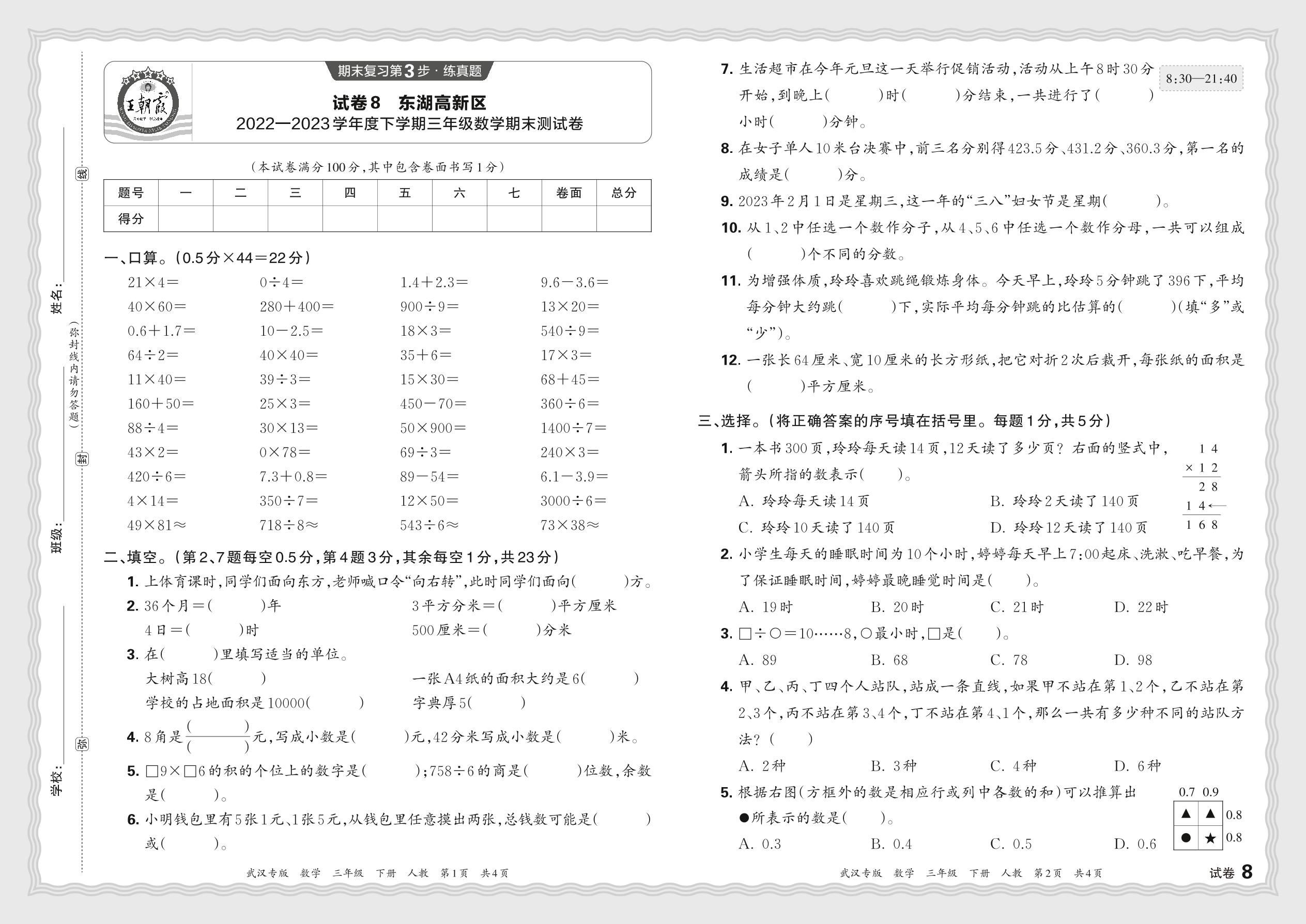 湖北省武汉市东湖高新区2022—2023学年度下学期三年级数学期末测试卷(人教版)【8】