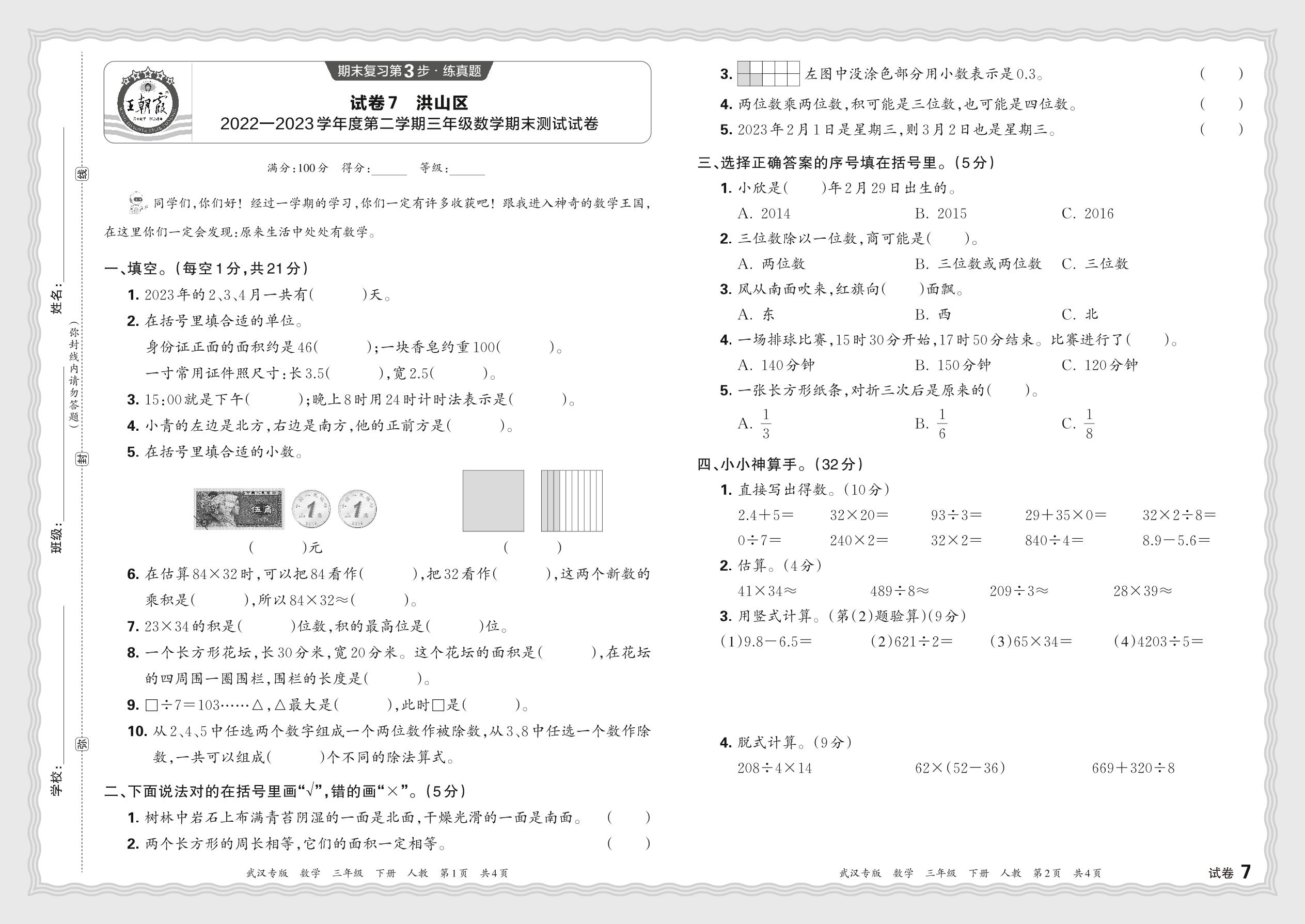 湖北省武汉市洪山区2022—2023学年度第二学期三年级数学期末测试试卷(人教版)【7】