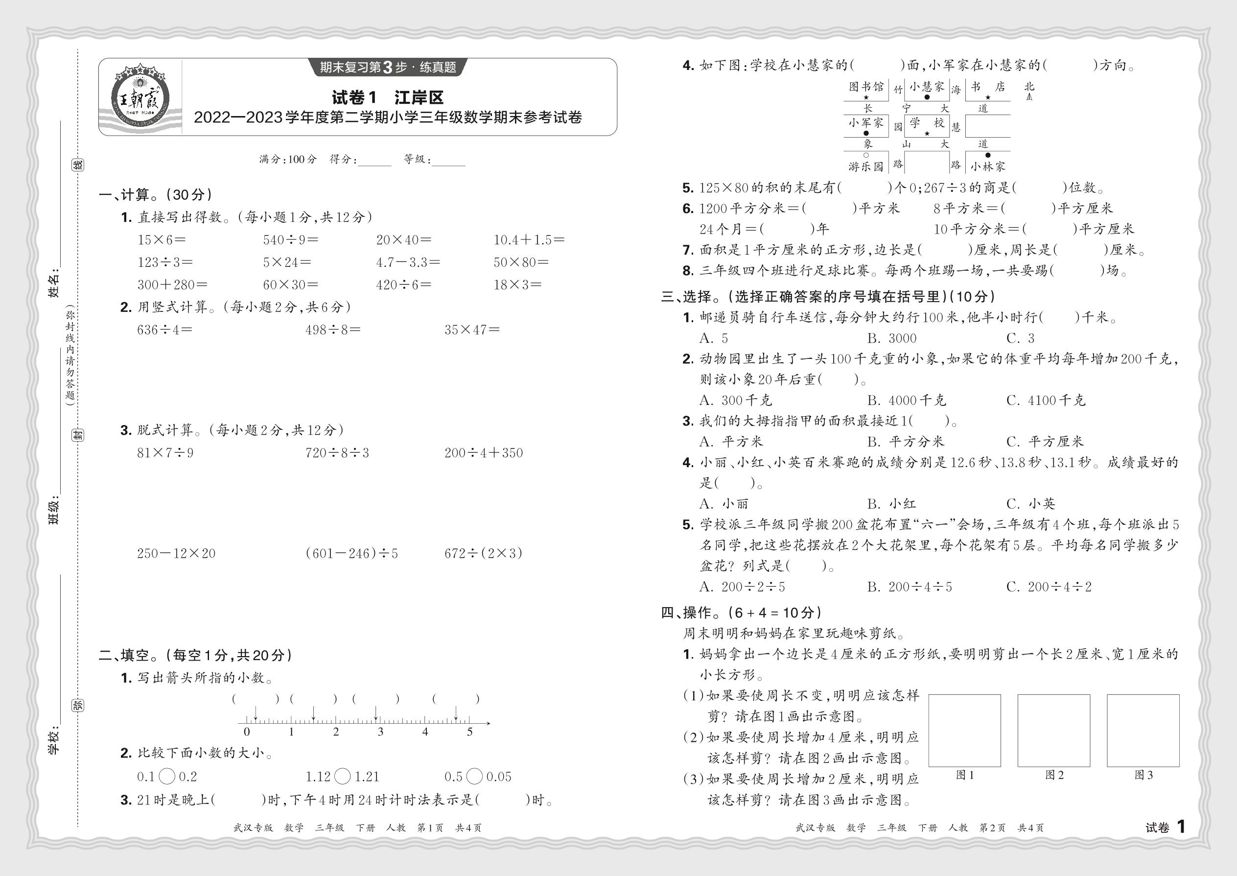 湖北省武汉市江岸区2022—2023学年度第二学期小学三年级数学期末参考试卷(人教版)【1】