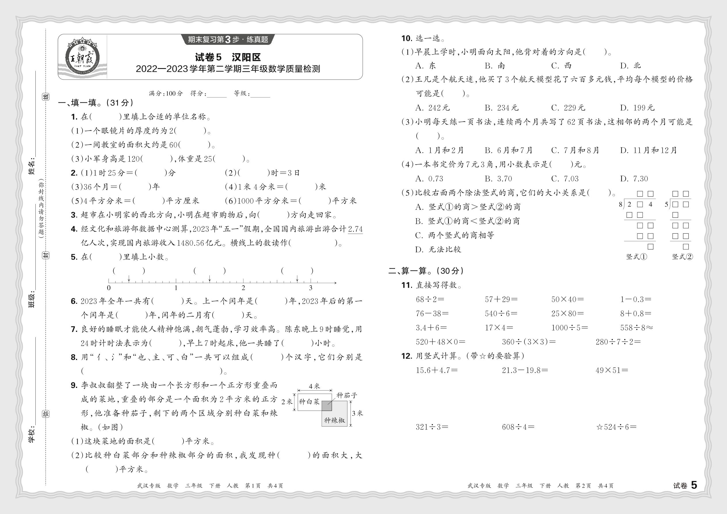 湖北省武汉市青山区2022—2023学年第二学期三年级数学质量检测(人教版)【5】