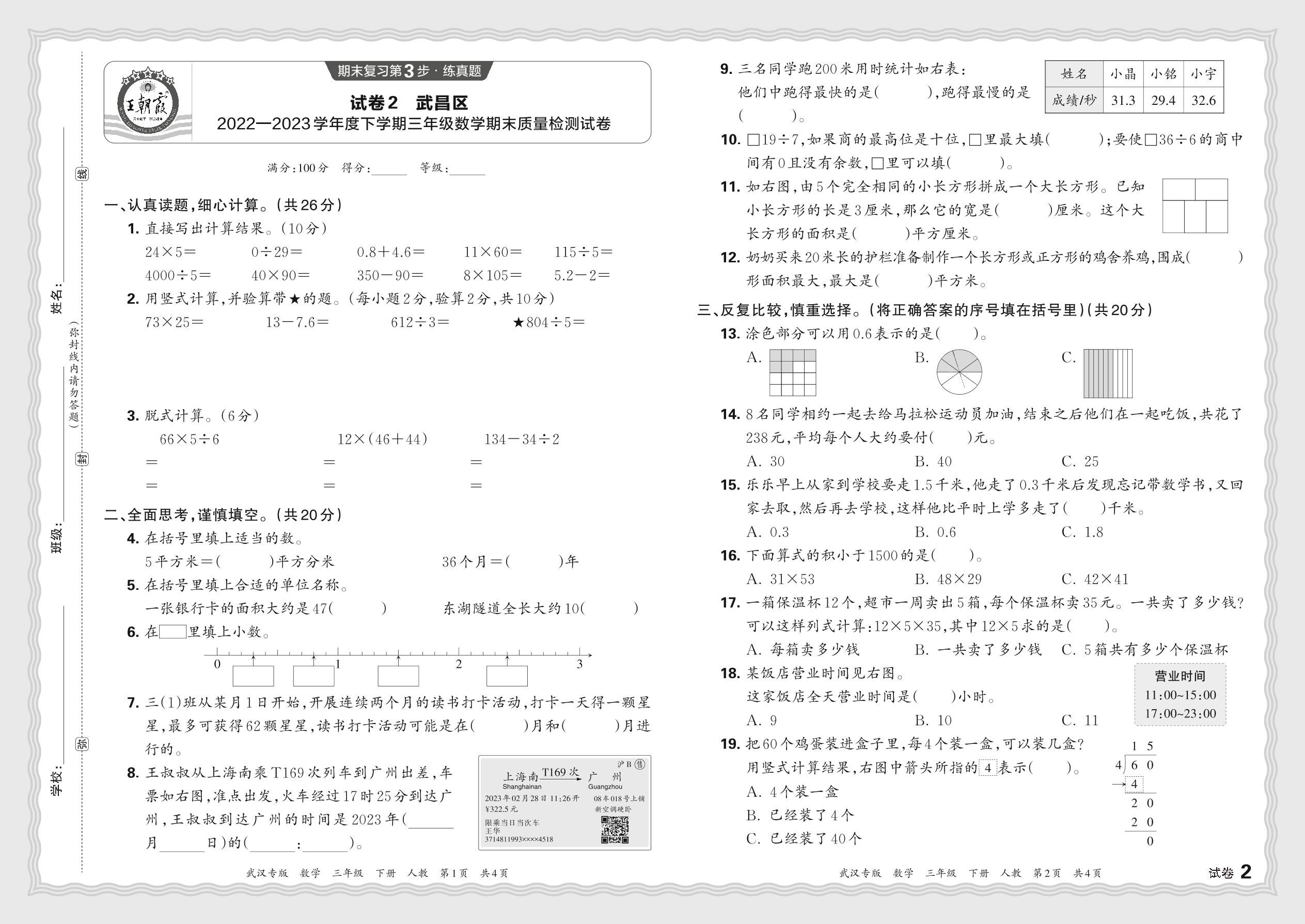 湖北省武汉市武昌区2022—2023学年度下学期三年级数学期末质量检测试卷(人教版)【2】