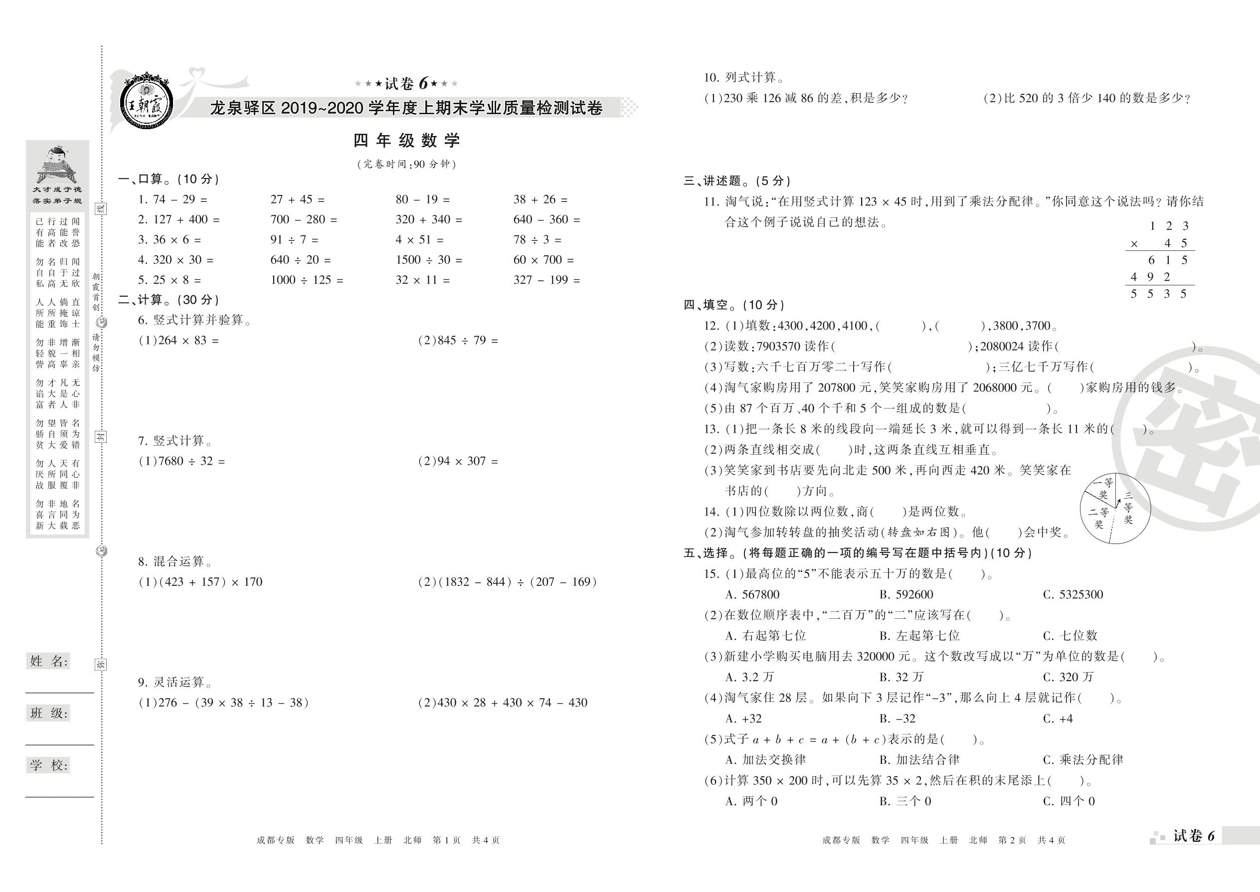2019-2020学年第一学期成都市龙泉驿区四年级数学试卷(北师版)【6】