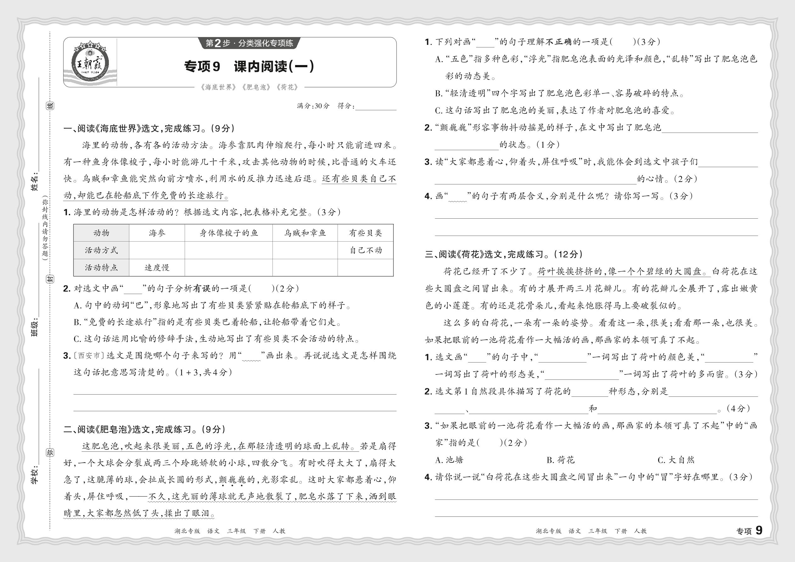 2024春下册三年级语文人教版 期末专项卷湖北版·课内阅读(一)【9】