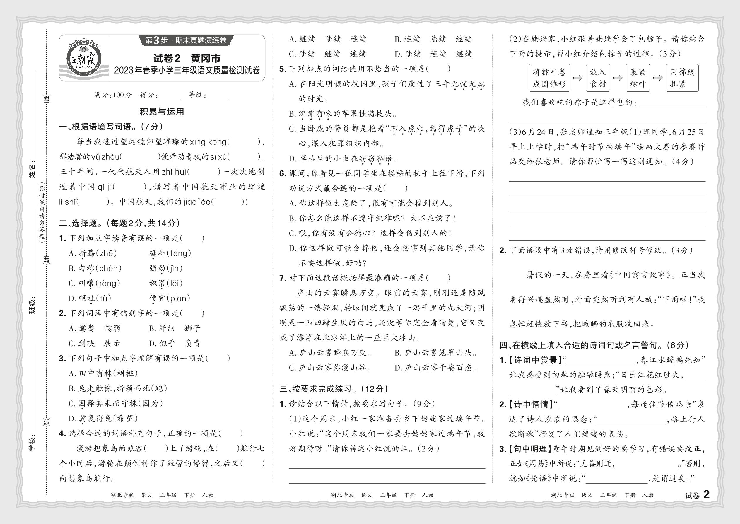 湖北省黄冈市2023年春季小学三年级语文质量检测试卷(人教版)【2】