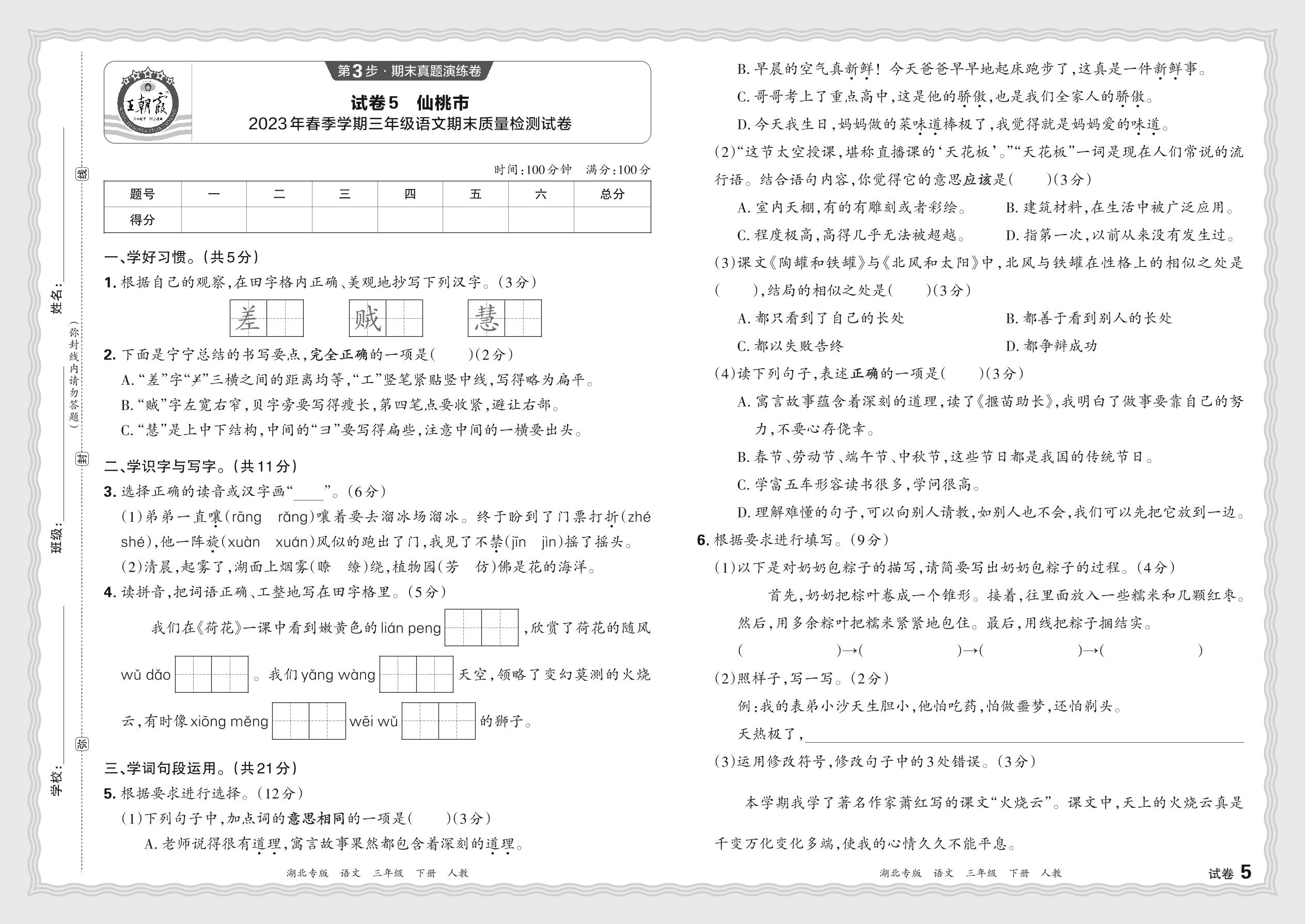 湖北省仙桃市2023年春季学期三年级语文期末质量检测试卷(人教版)【5】