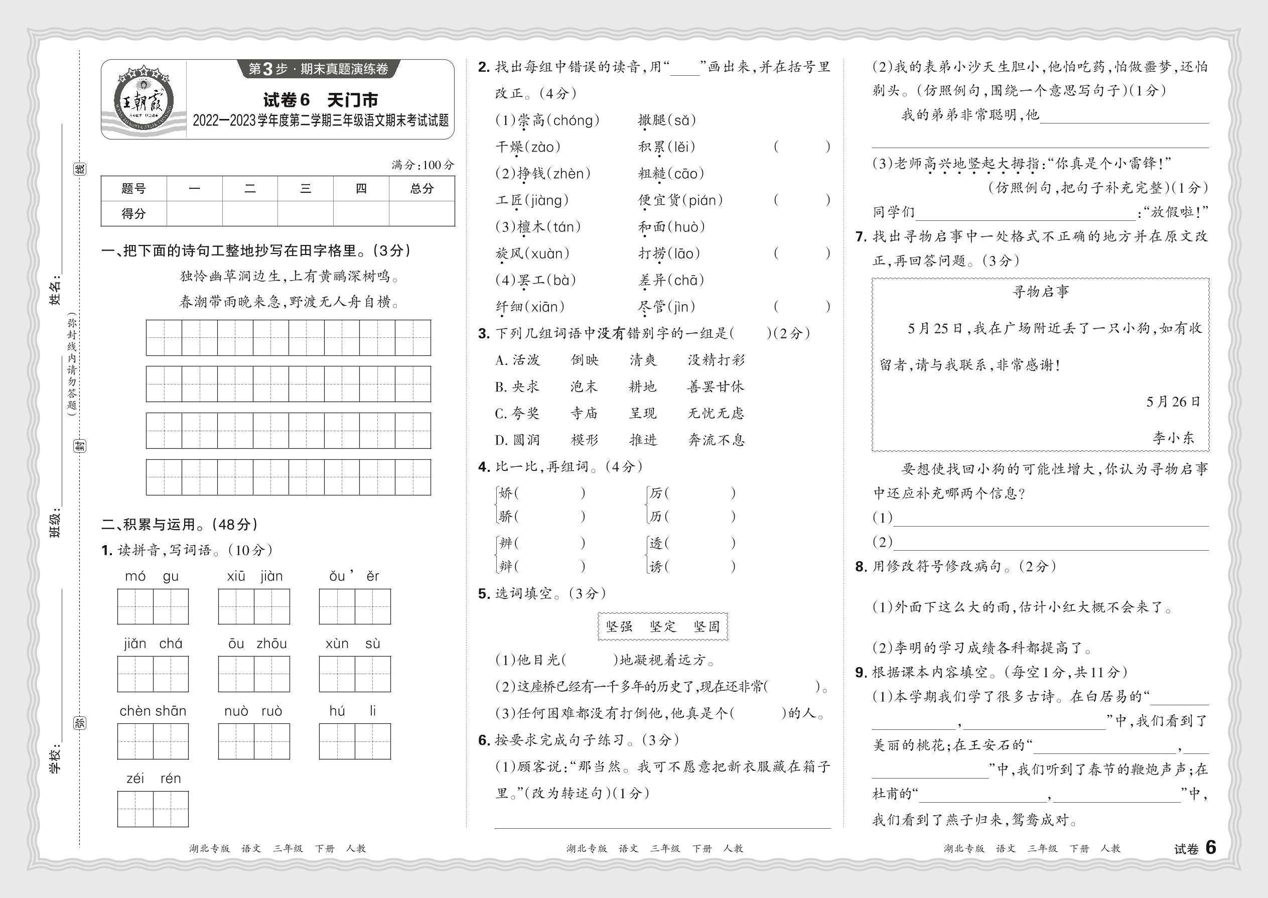湖北省天门市2022—2023学年度第二学期三年级语文期末考试试题(人教版)【6】