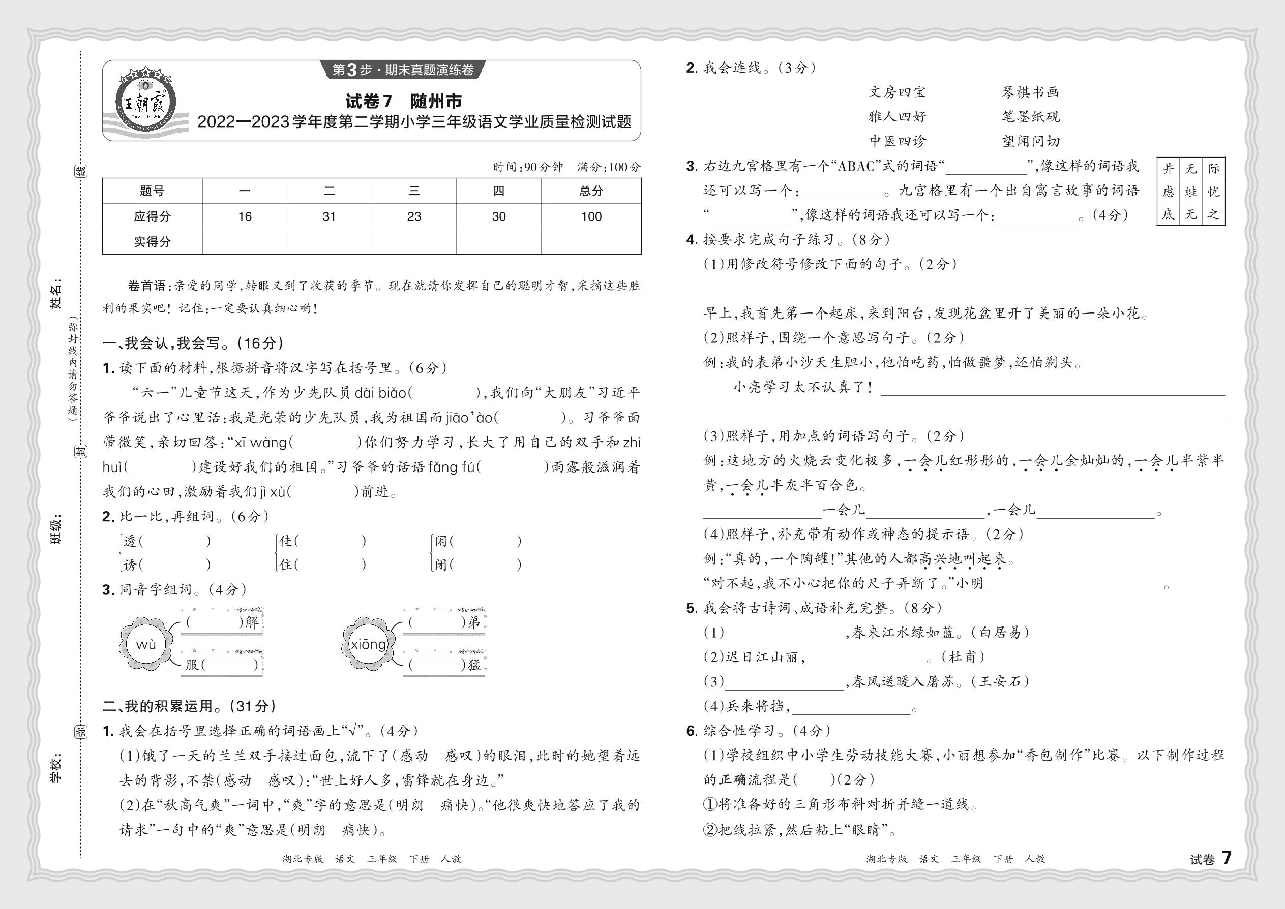 湖北省随州市2022—2023学年度第二学期小学三年级语文学业质量检测试题(人教版)【7】