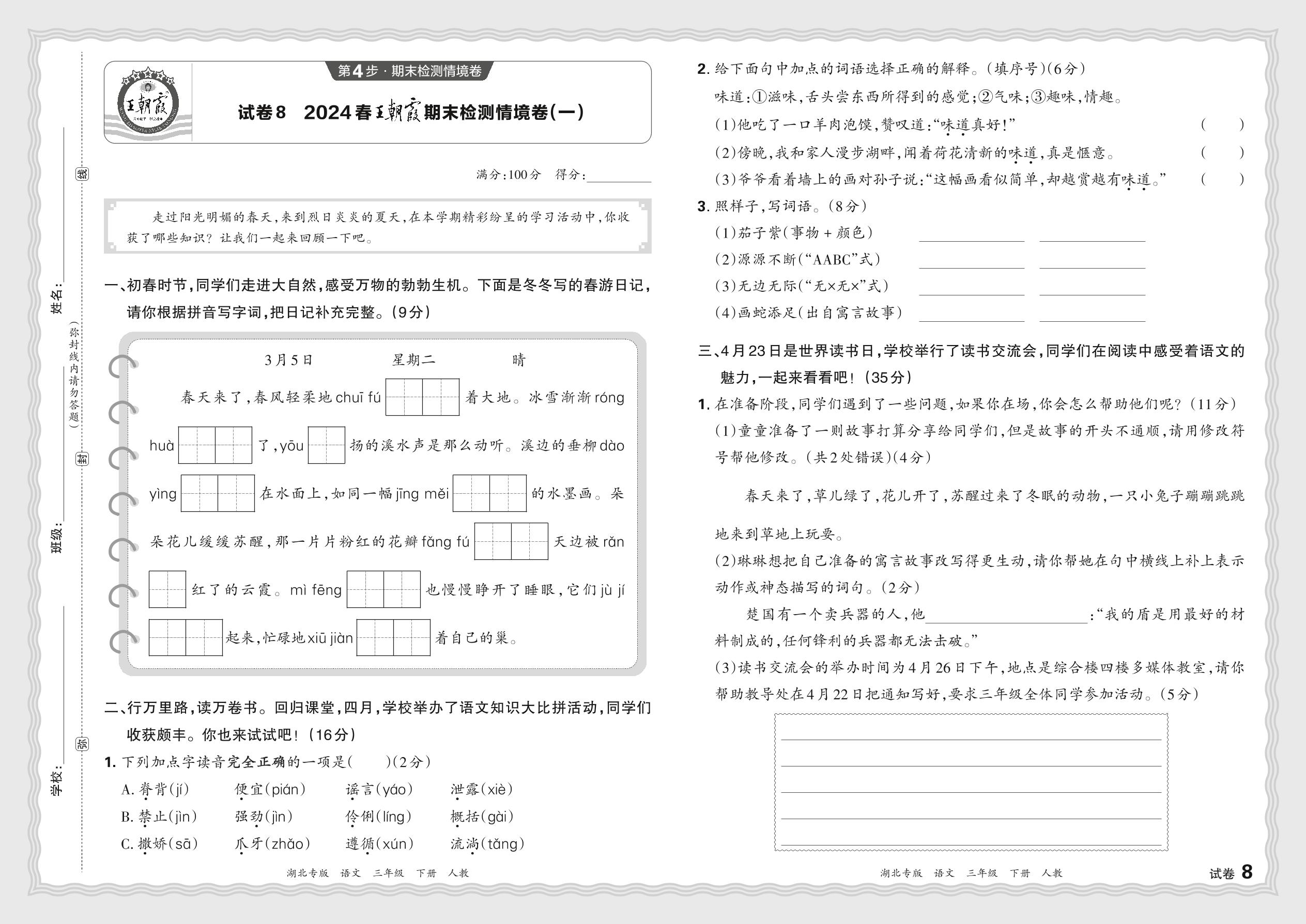 2024春下册三年级语文人教版 湖北王朝霞期末检测情境卷(一)