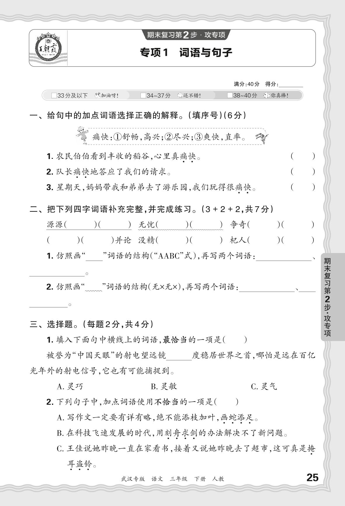2024春下册三年级语文人教版 期末专项卷武汉版·词语与句子【1】