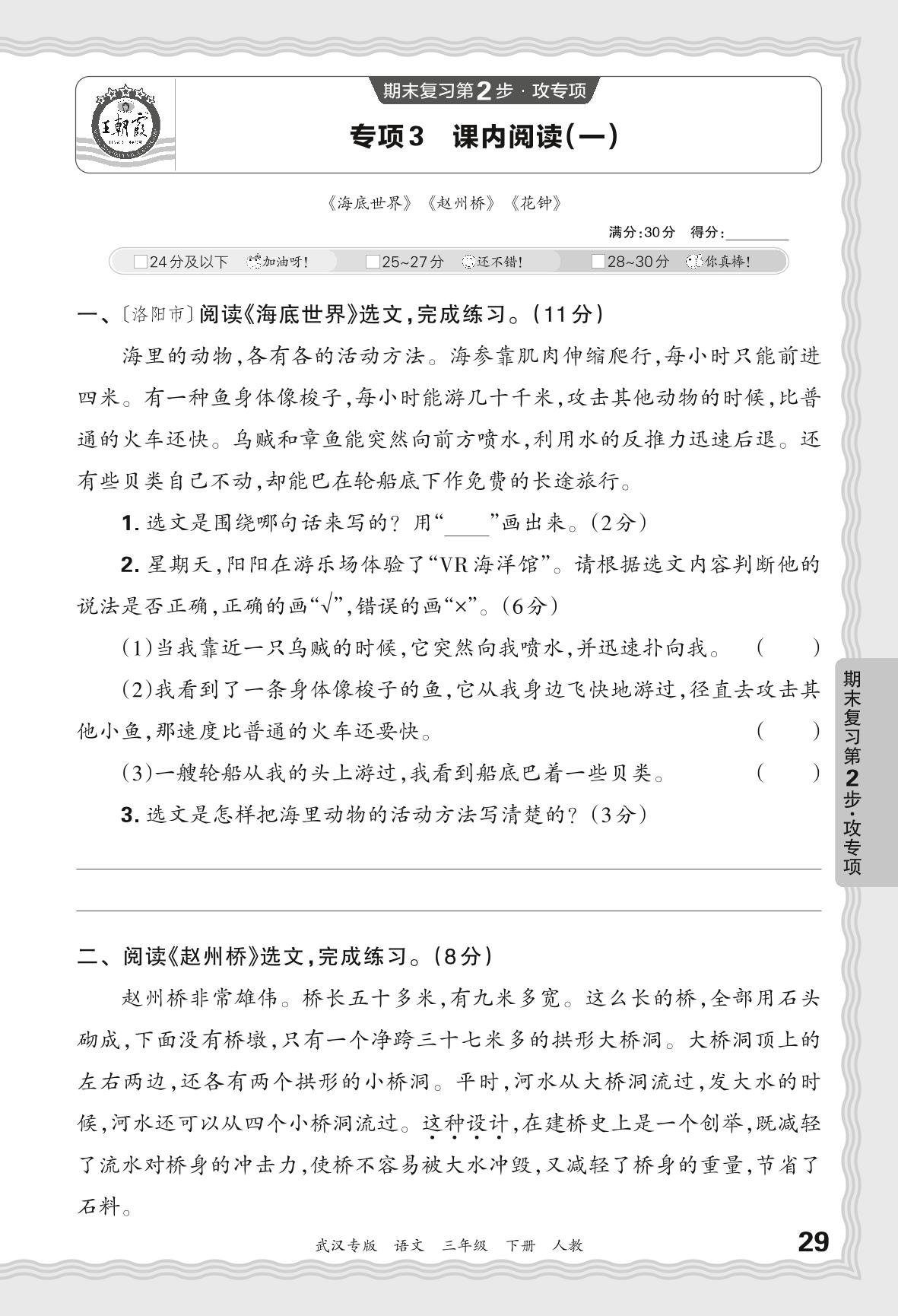 2024春下册三年级语文人教版 期末专项卷武汉版·课内阅读(一)【3】