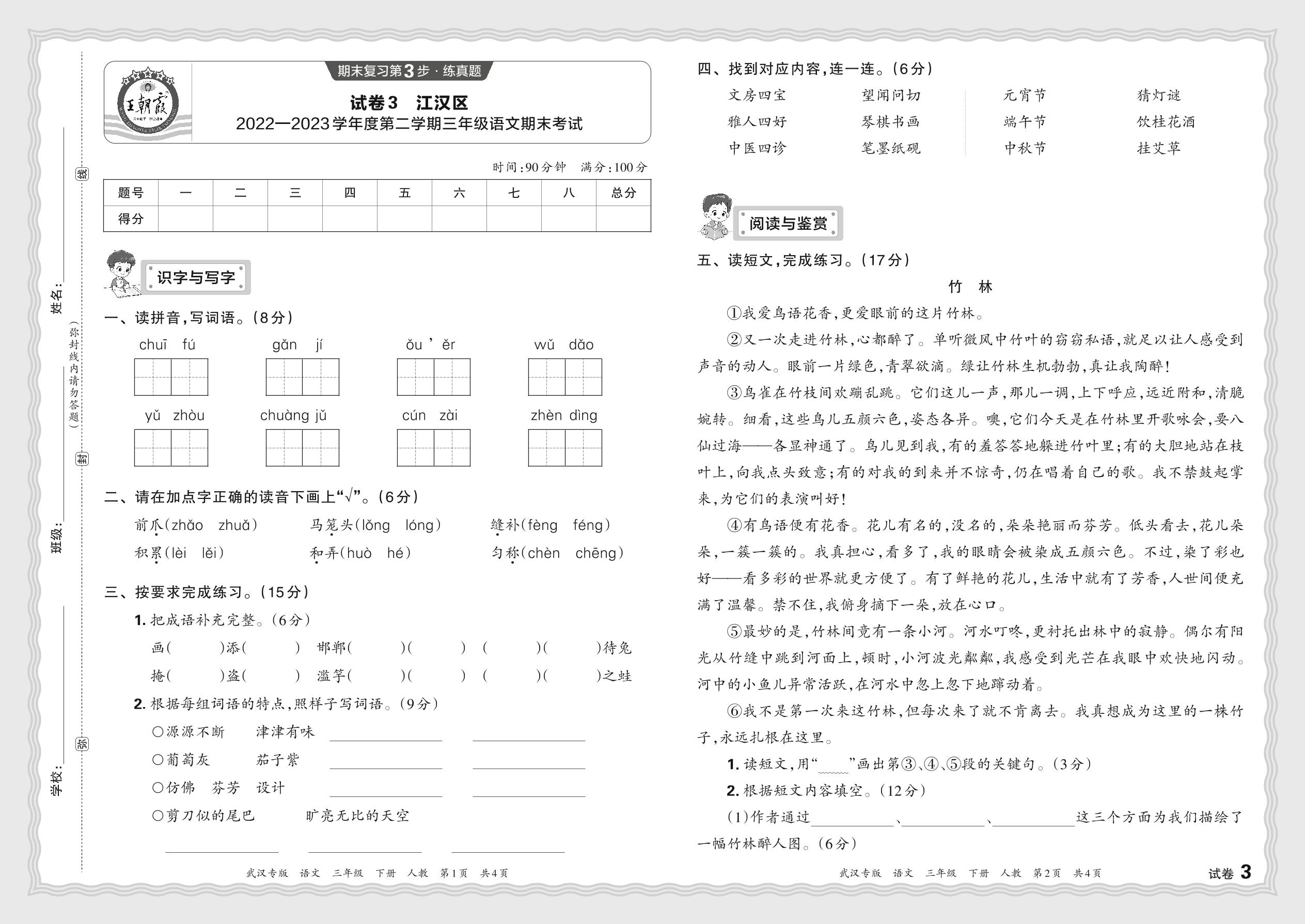 湖北省武汉市江汉区2022—2023学年度第二学期三年级语文期末考试(人教版)【3】