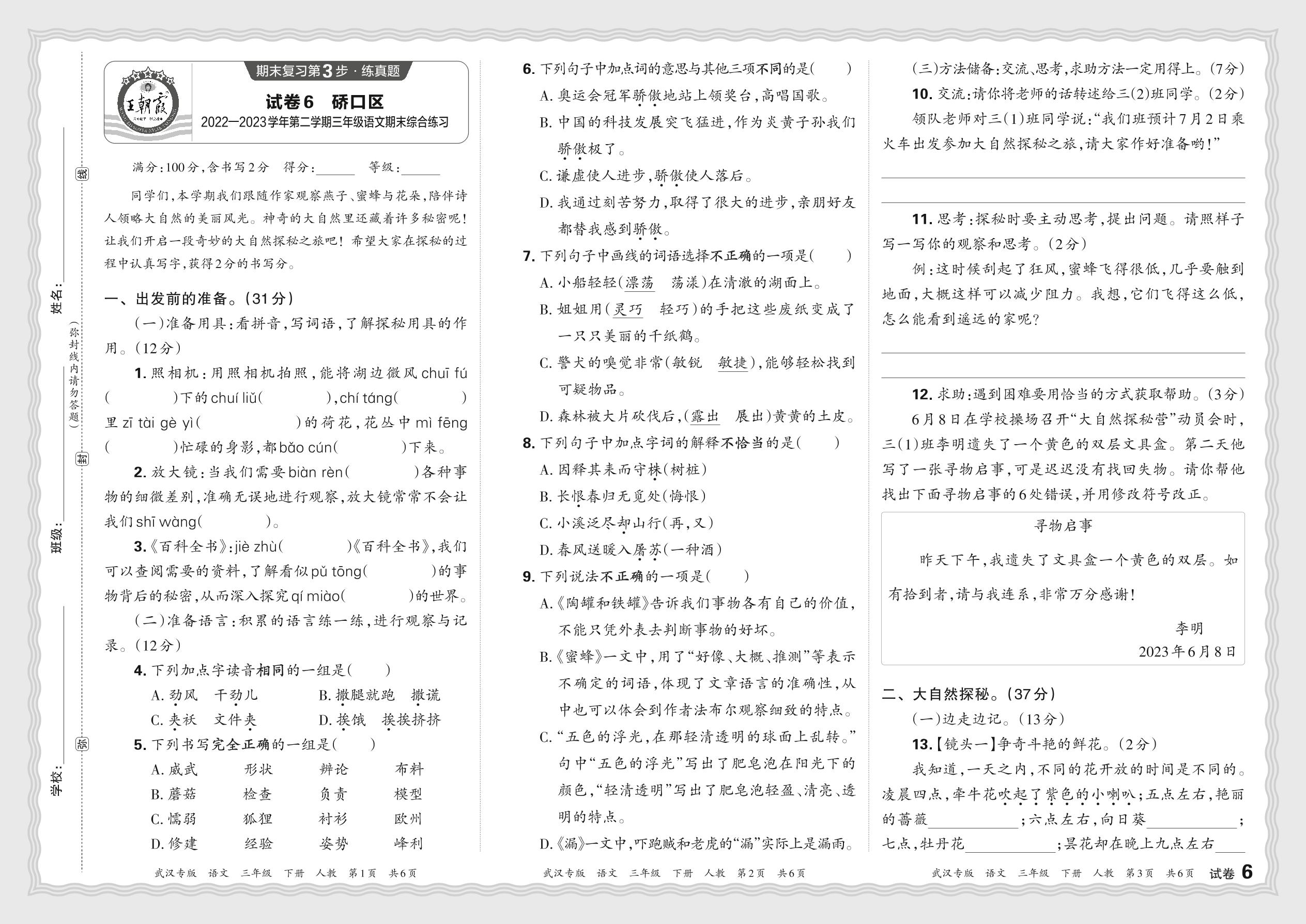 湖北省武汉市硚口区2022—2023学年第二学期三年级语文期末综合练习(人教版)【6】