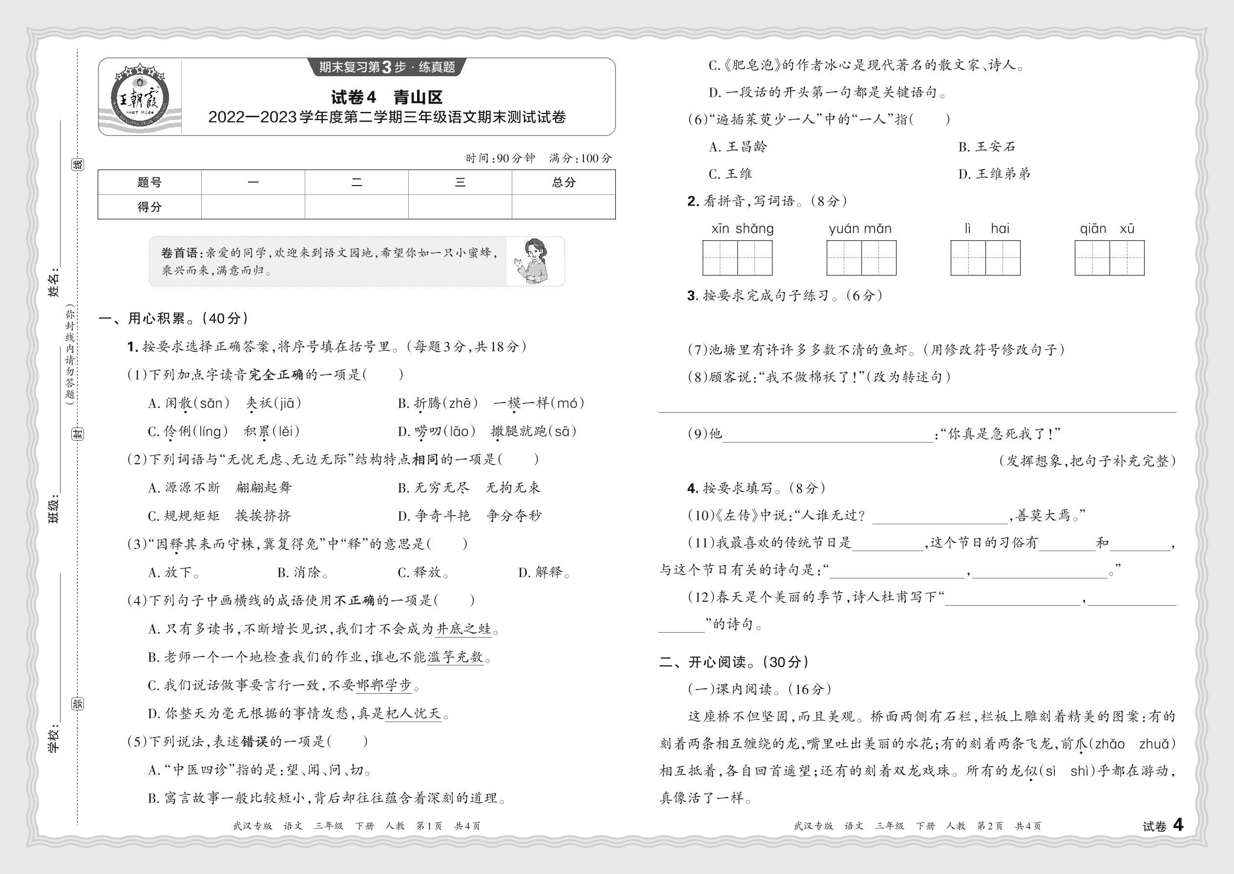 湖北省武汉市青山区2022—2023学年度第二学期三年级语文期末测试试卷(人教版)【4】