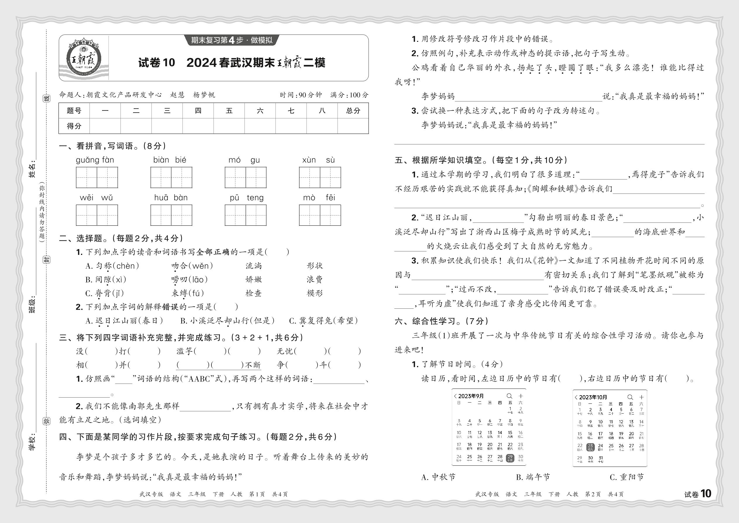 2024春下册三年级语文人教版 湖北武汉期末王朝霞二模
