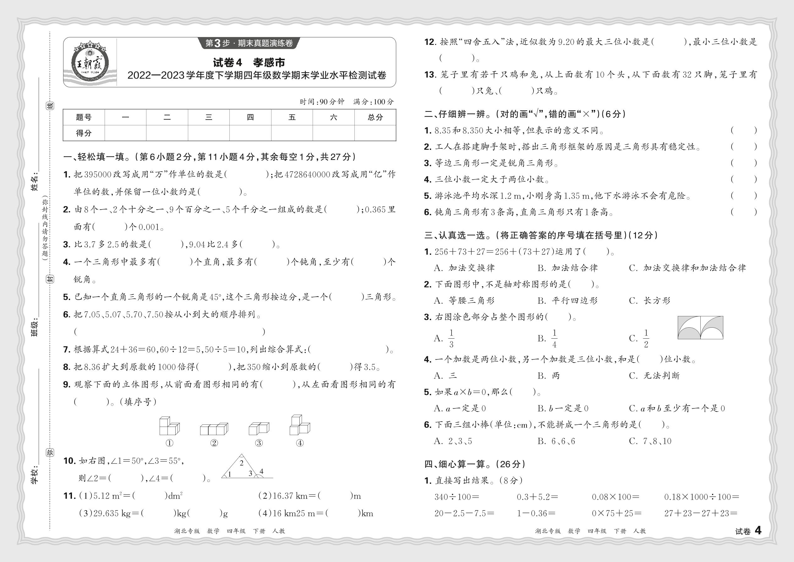 湖北省孝感市2022—2023学年度下学期四年级数学期末学业水平检测试卷(人教版)【4】