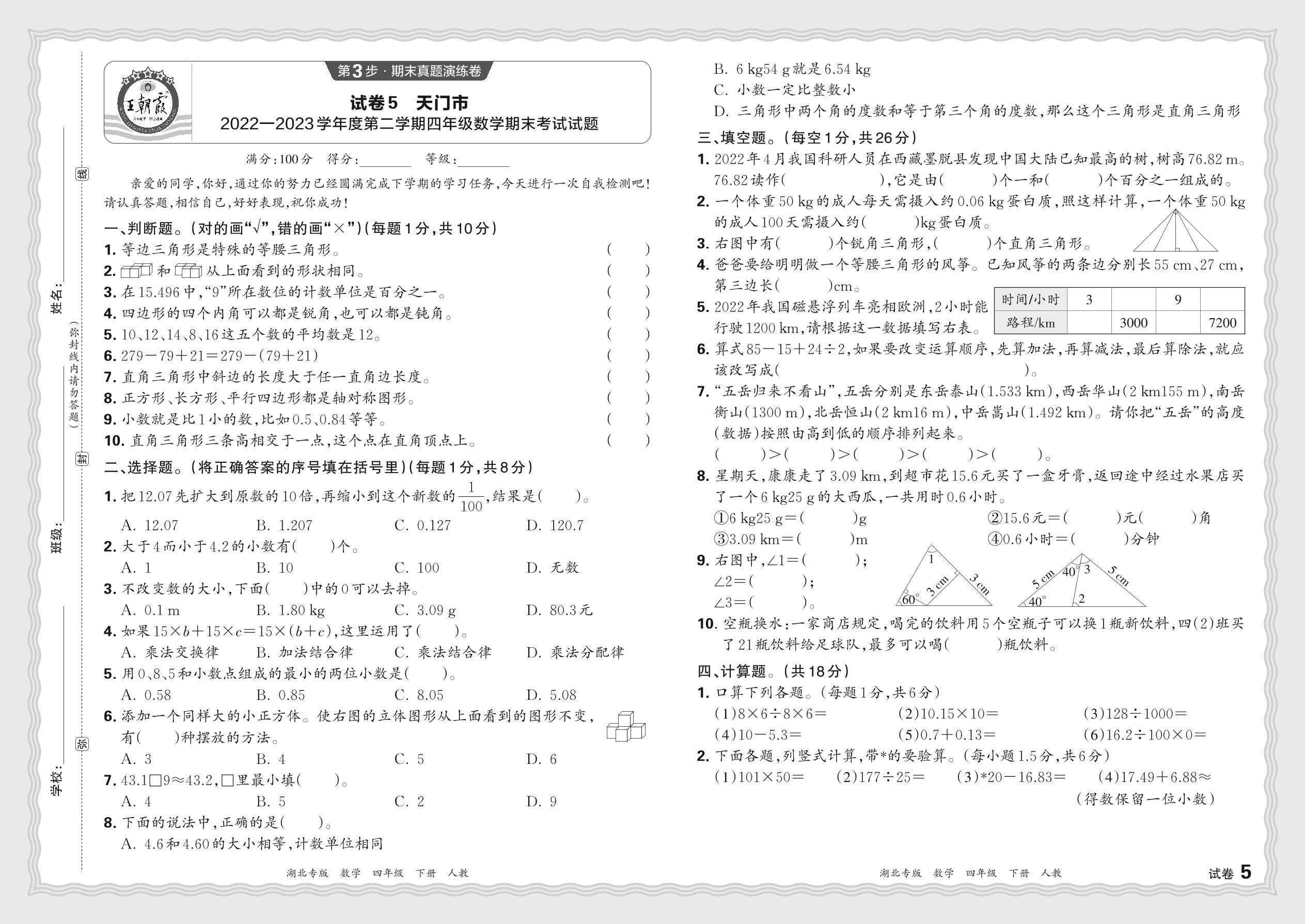 湖北省天门市2022—2023学年度第二学期四年级数学期末考试试题(人教版)【5】