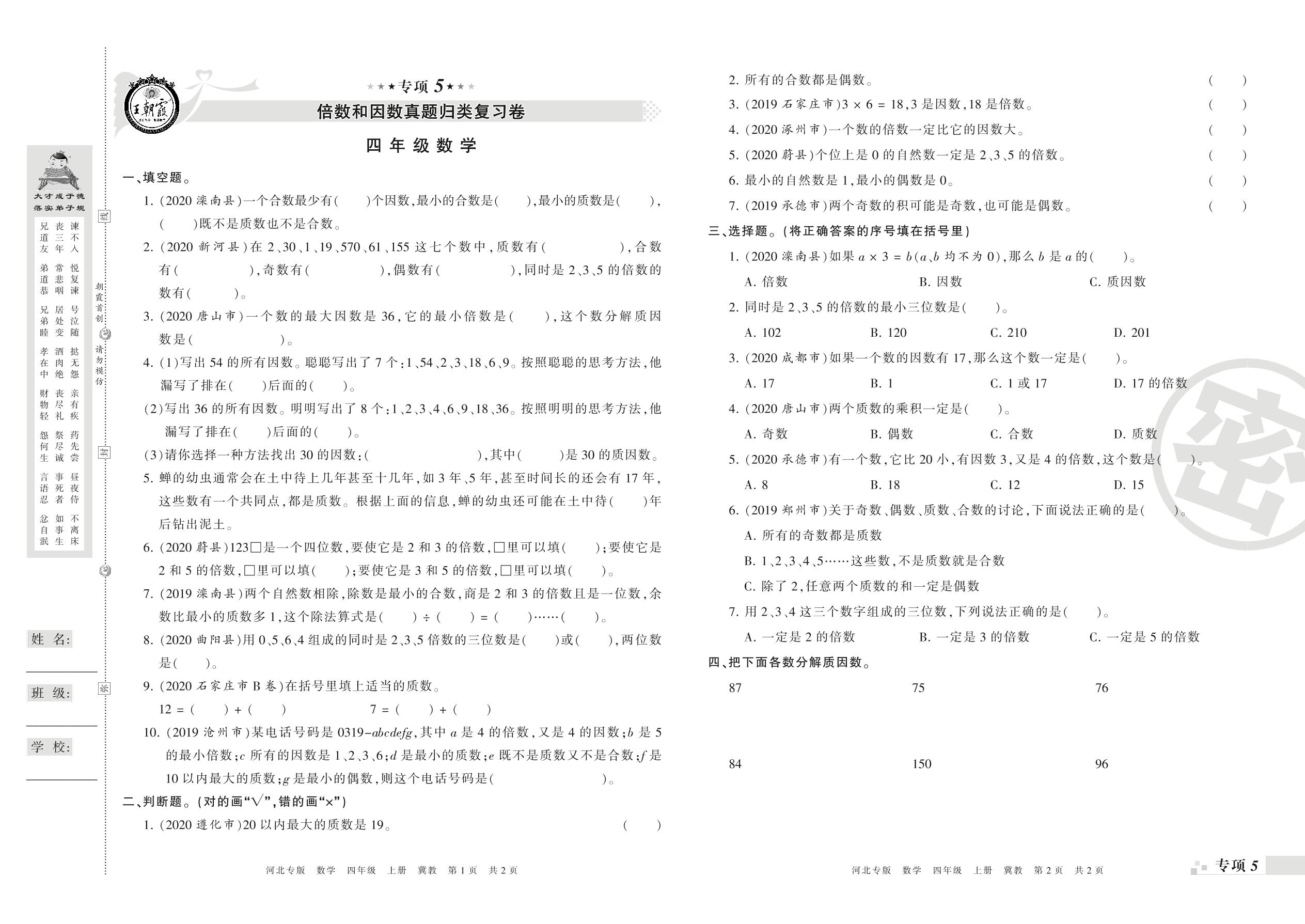 王朝霞期末专项卷——倍数和因数、线和角及垂线和平行线真题归类复习四年级上册数学(冀教版)【0】