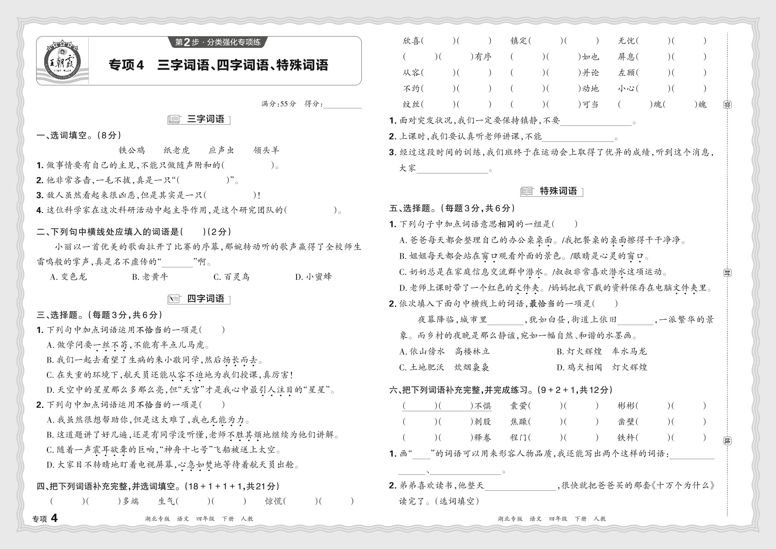 2024春下册四年级语文人教版 期末专项卷湖北版·三字词语、四字词语、特殊词语【4】