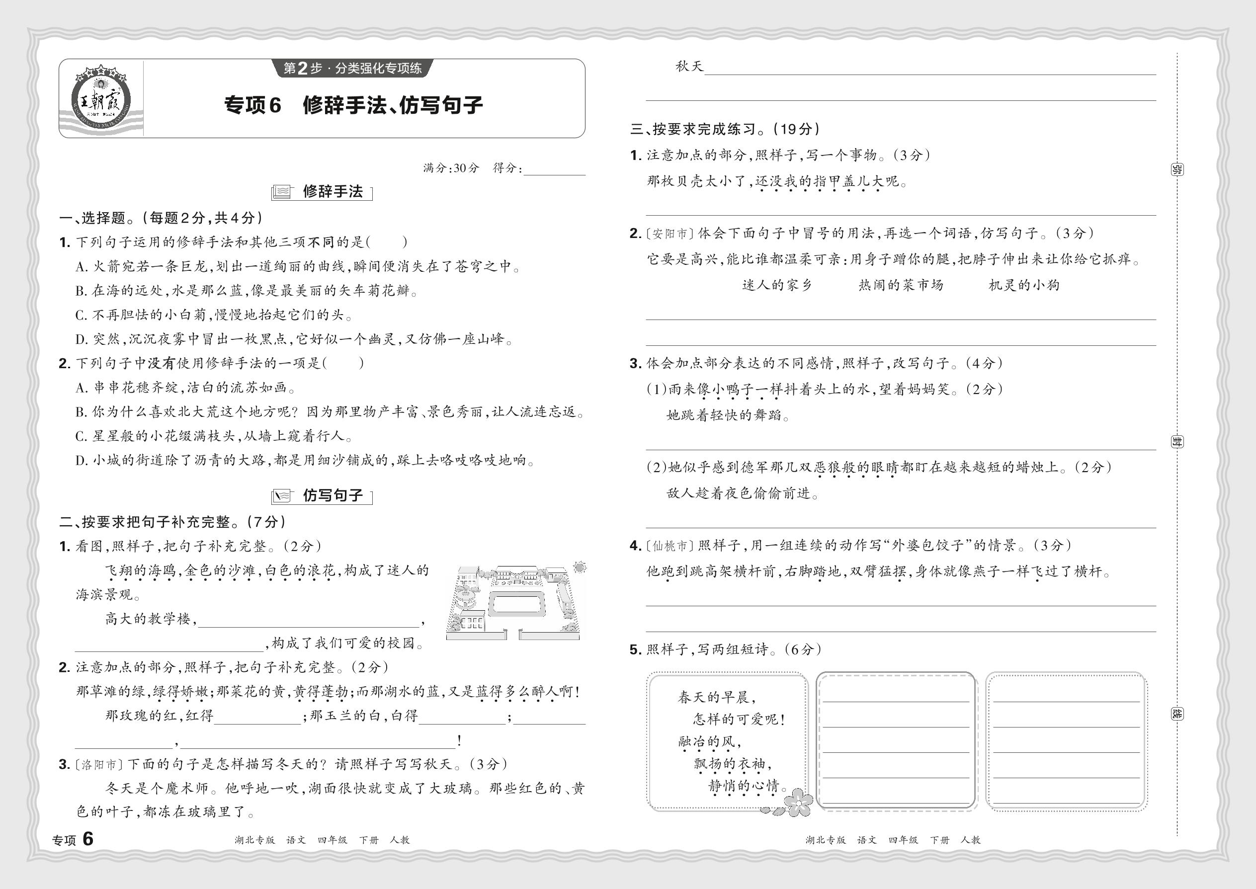 2024春下册四年级语文人教版 期末专项卷湖北版·修辞手法、仿写句子【6】