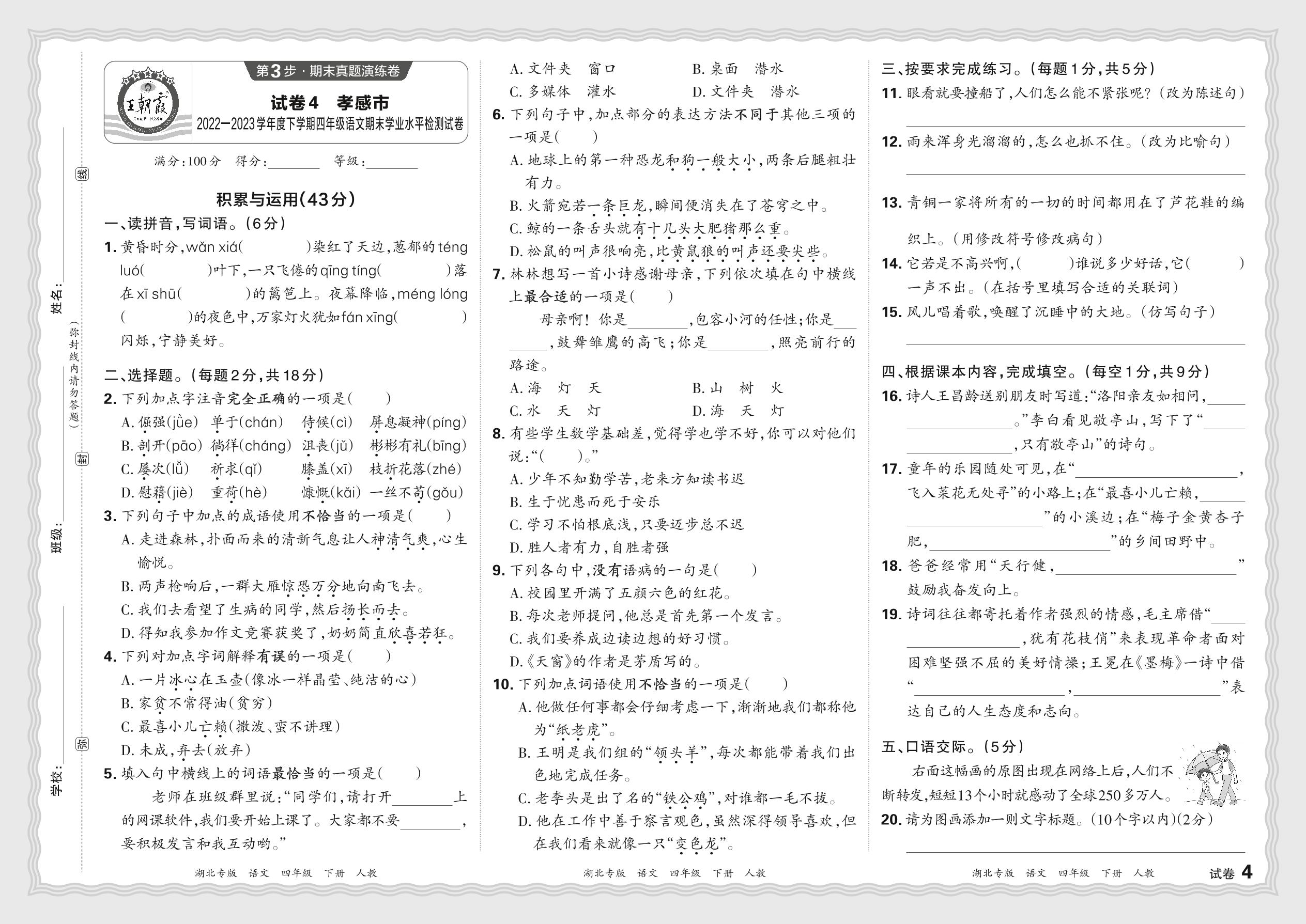 湖北省孝感市2022—2023学年度下学期四年级语文期末学业水平检测试卷(人教版)【4】