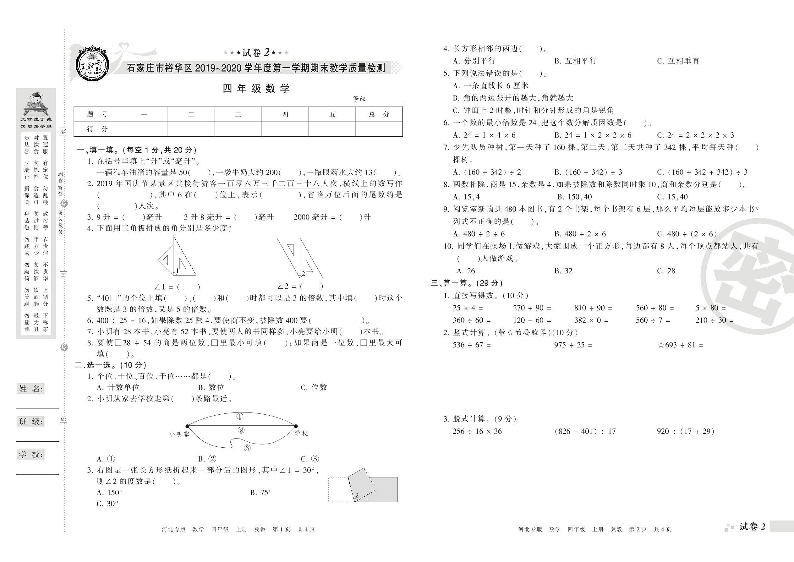 2019-2020学年第一学期石家庄市裕华区四年级数学试卷(冀教版)【2】