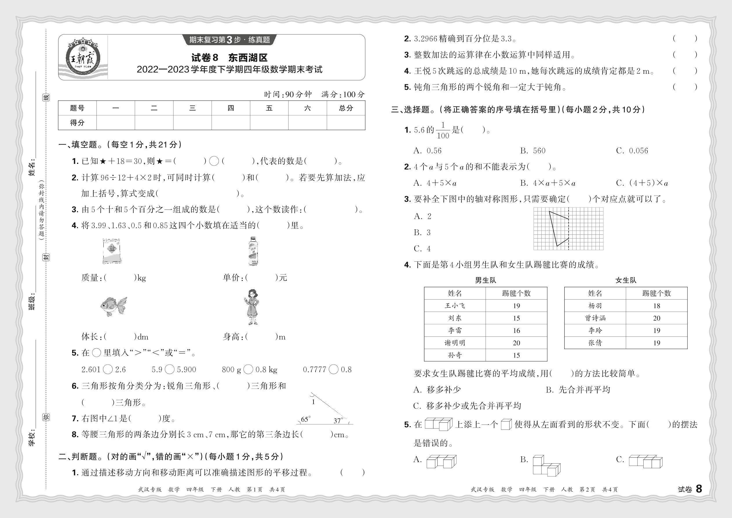 湖北省武汉市东西湖区2022—2023学年度下学期四年级数学期末考试(人教版)【8】