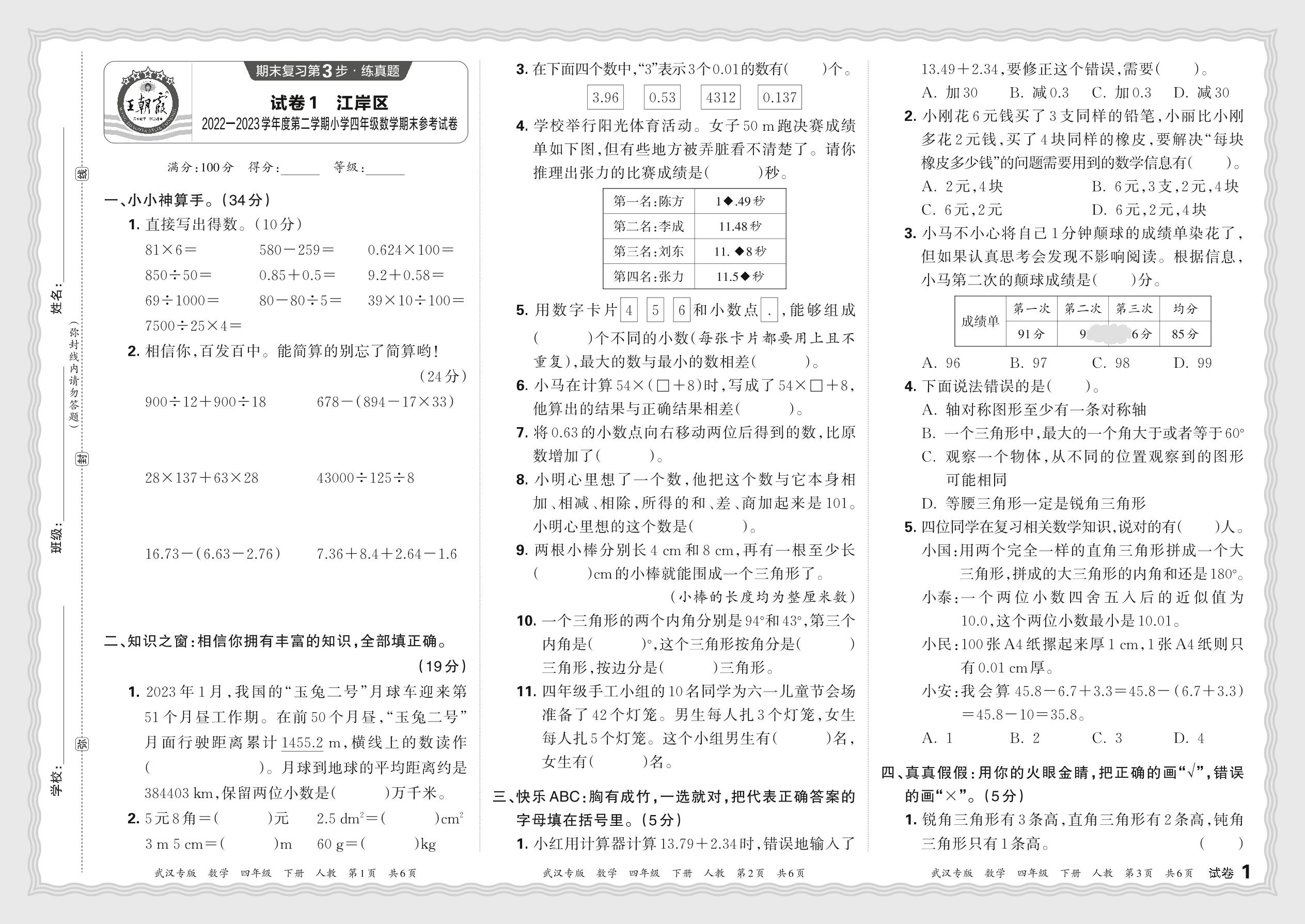 湖北省武汉市江岸区2022—2023学年度第二学期小学四年级数学期末参考试卷(人教版)【1】