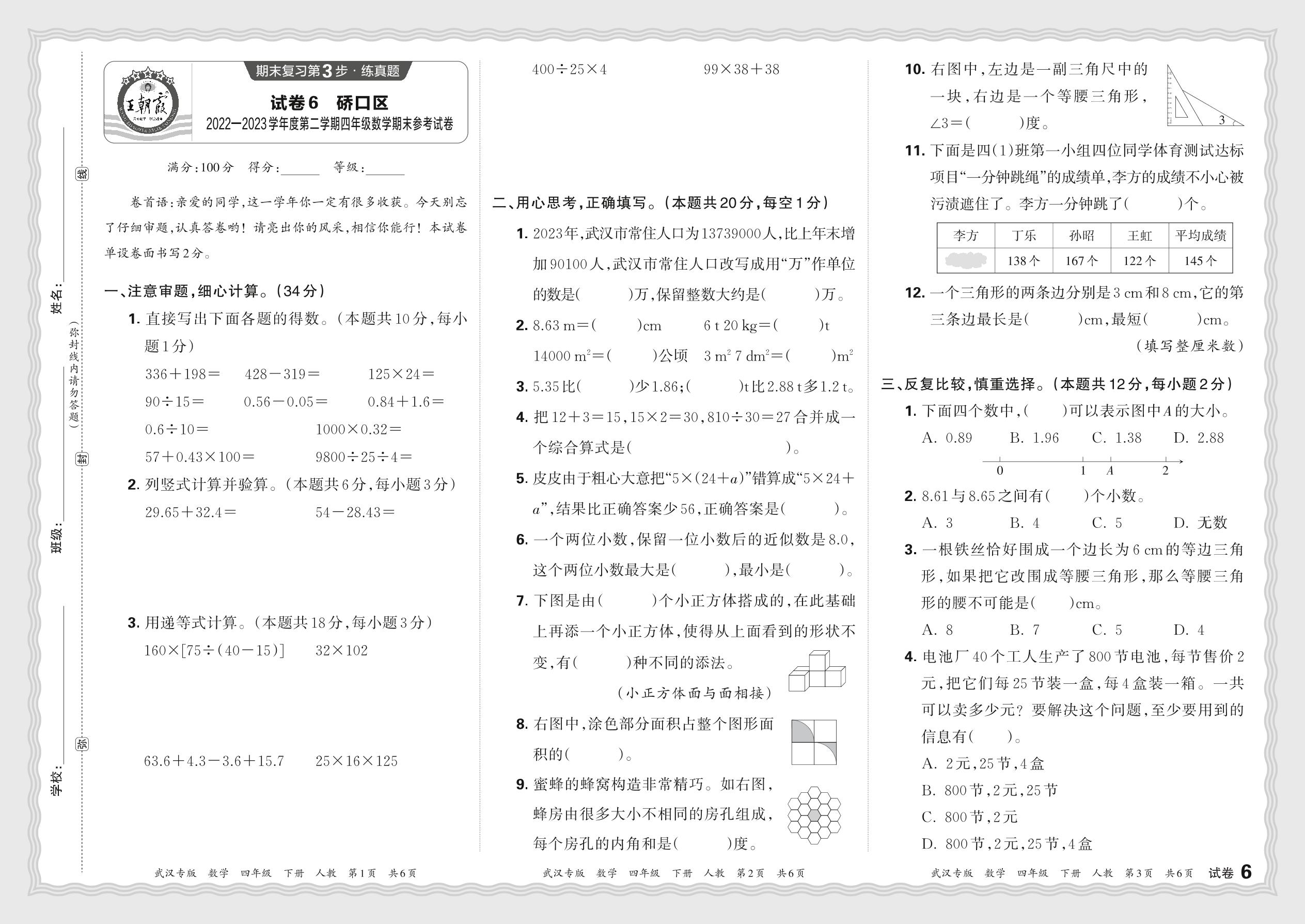 湖北省武汉市硚口区2022—2023学年度第二学期四年级数学期末参考试卷(人教版)【6】