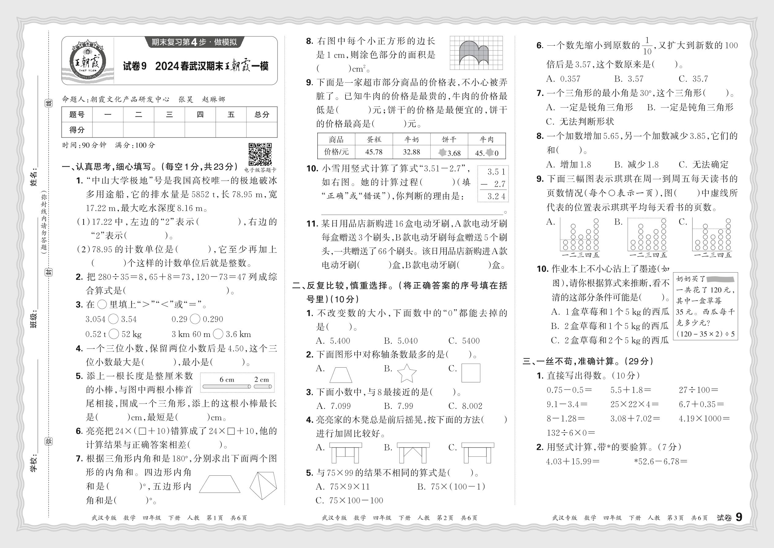 2024春下册四年级数学人教版 湖北武汉期末王朝霞一模