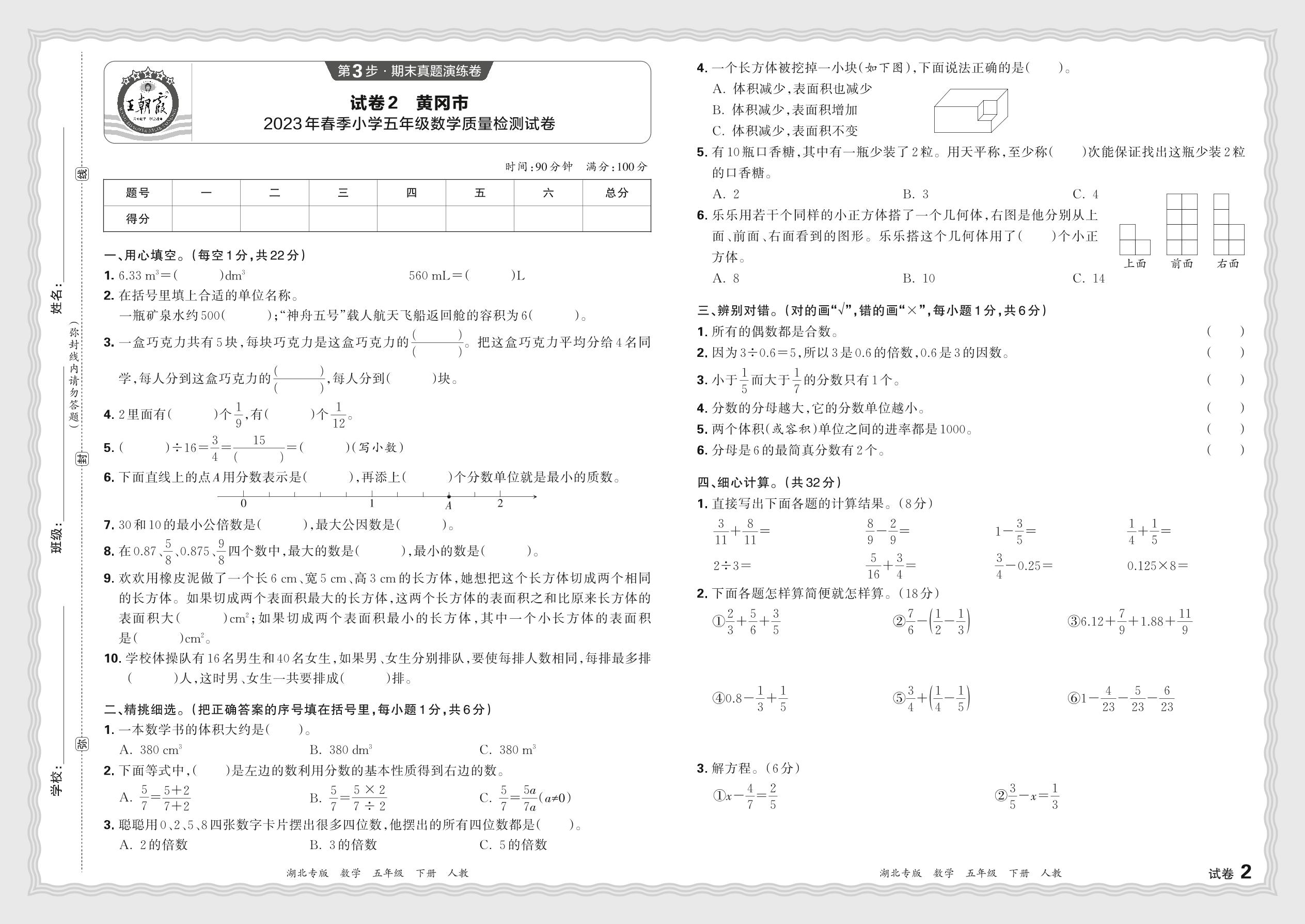 五年级数学人教版下册期末卷