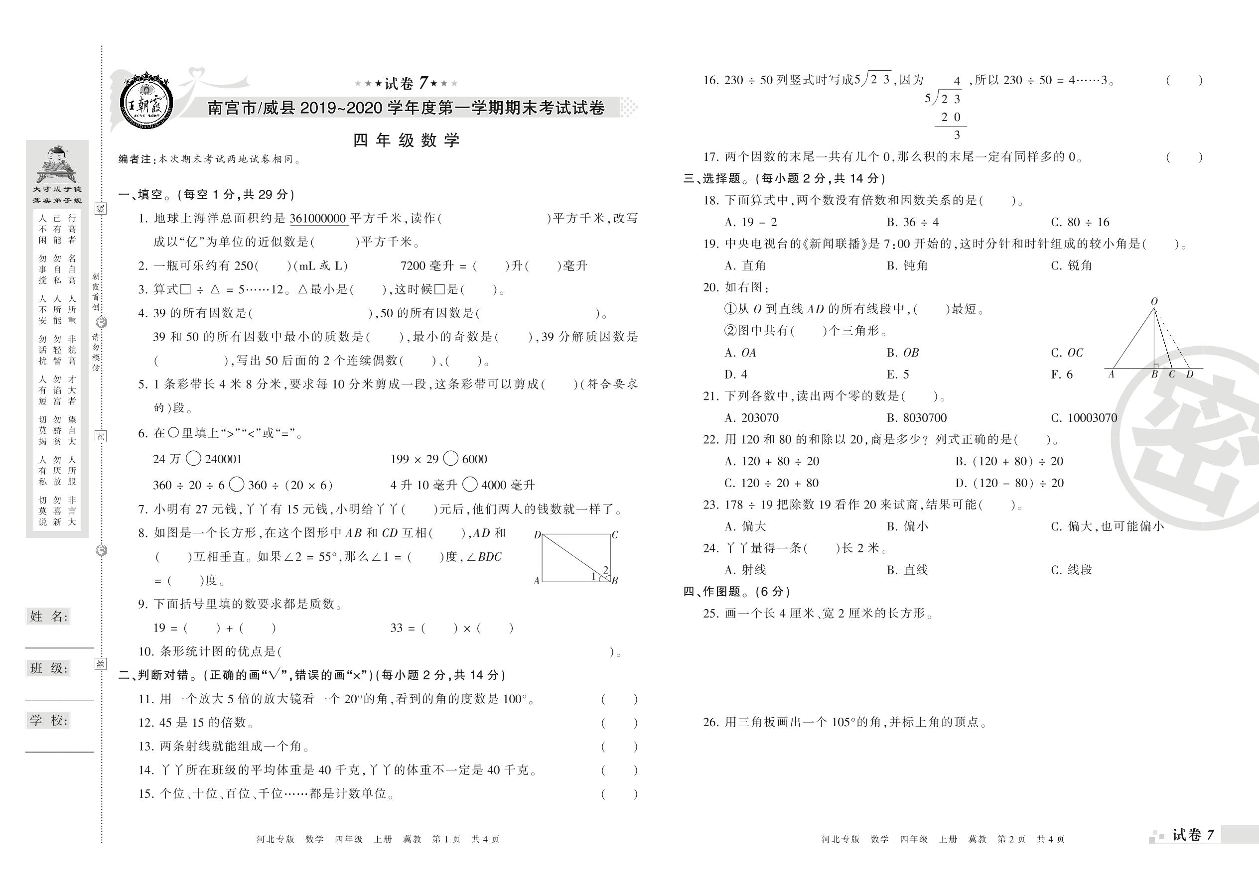 2019-2020学年第一学期南宫市(威县)四年级数学试卷(冀教版)【7】
