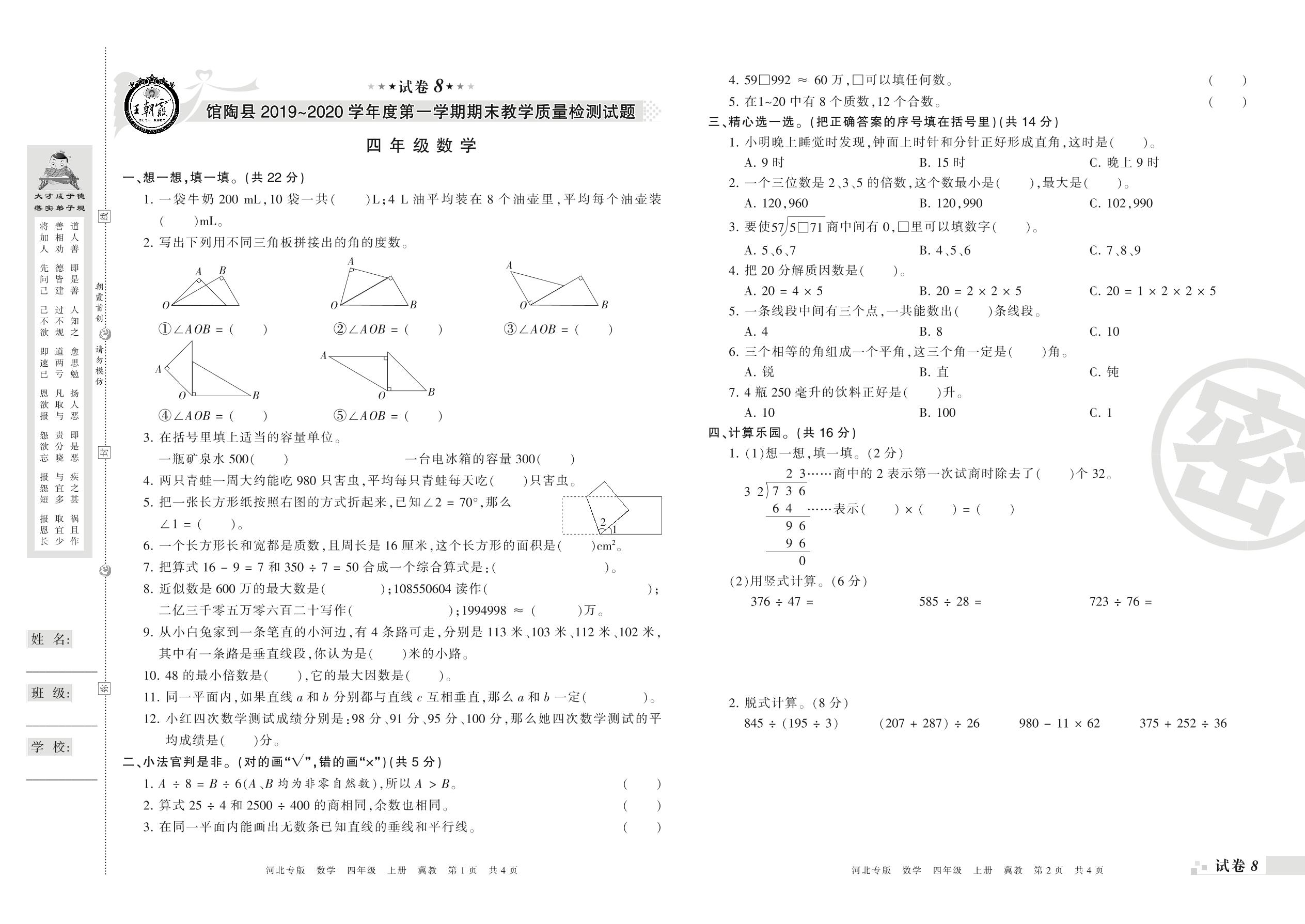2019-2020学年第一学期邯郸市馆陶县四年级数学试卷(冀教版)【8】