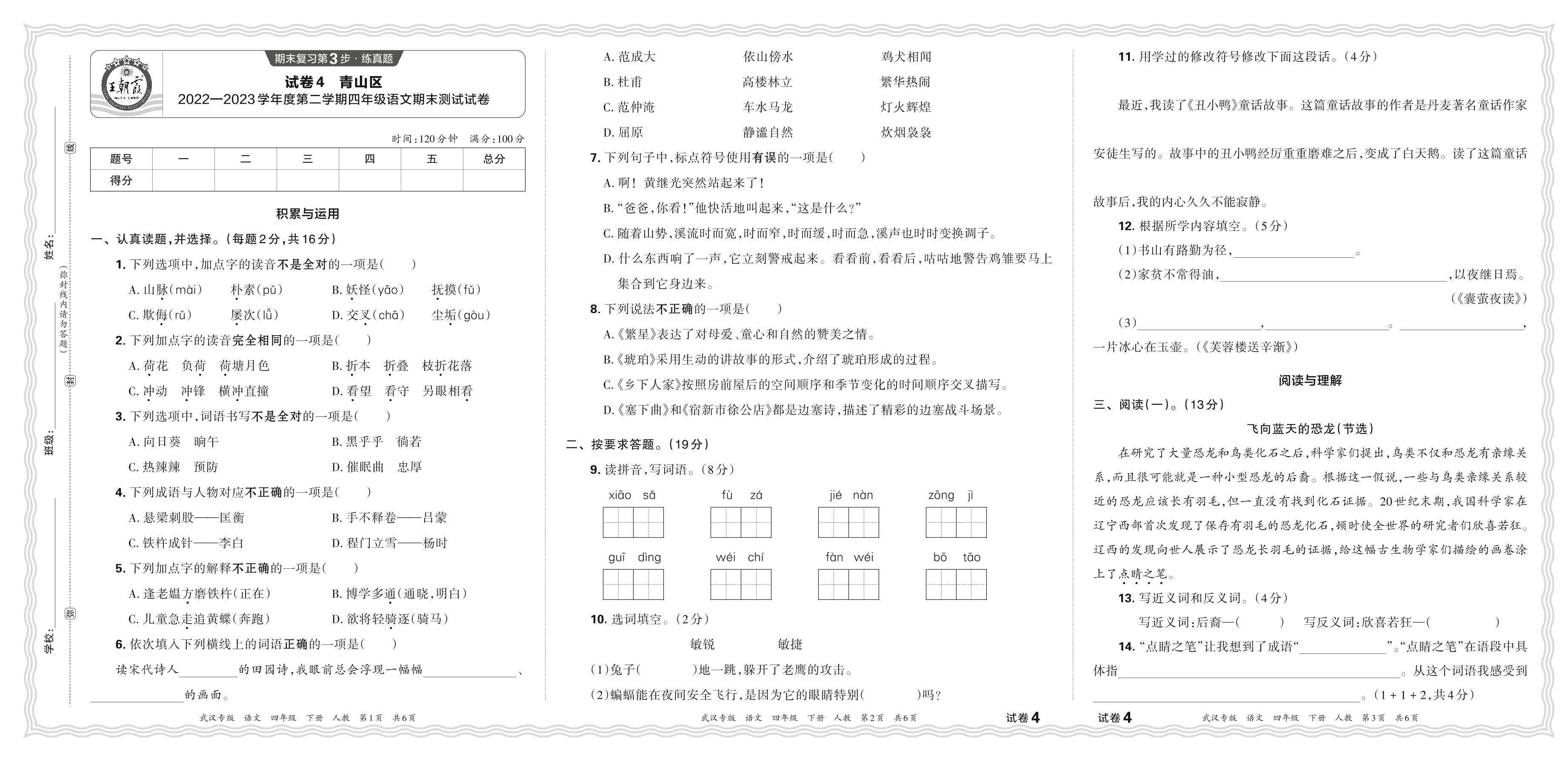 湖北省武汉市青山区2022—2023学年度第二学期四年级语文期末测试试卷(人教版)【4】