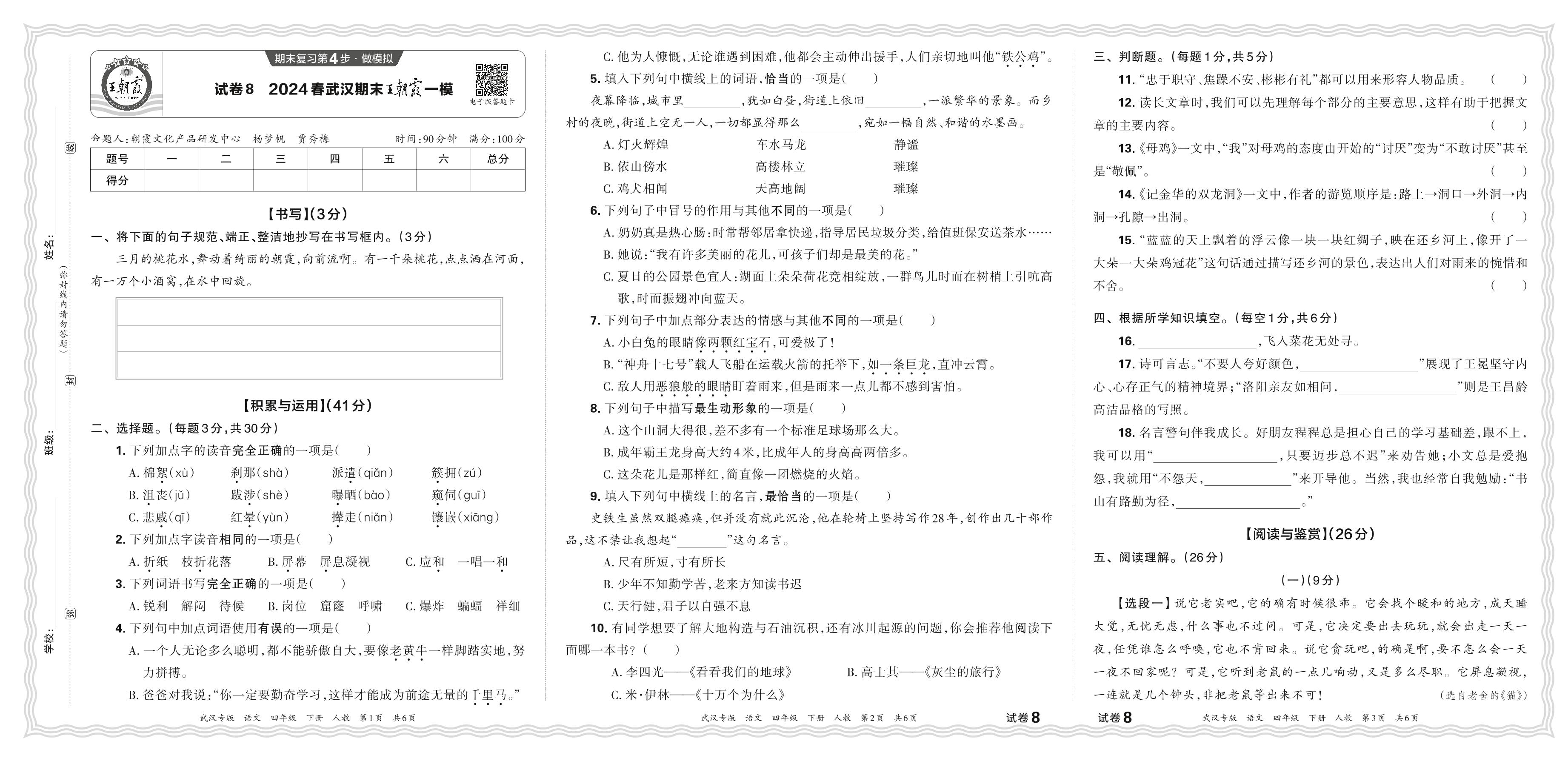 2024春下册四年级语文人教版 湖北武汉期末王朝霞一模