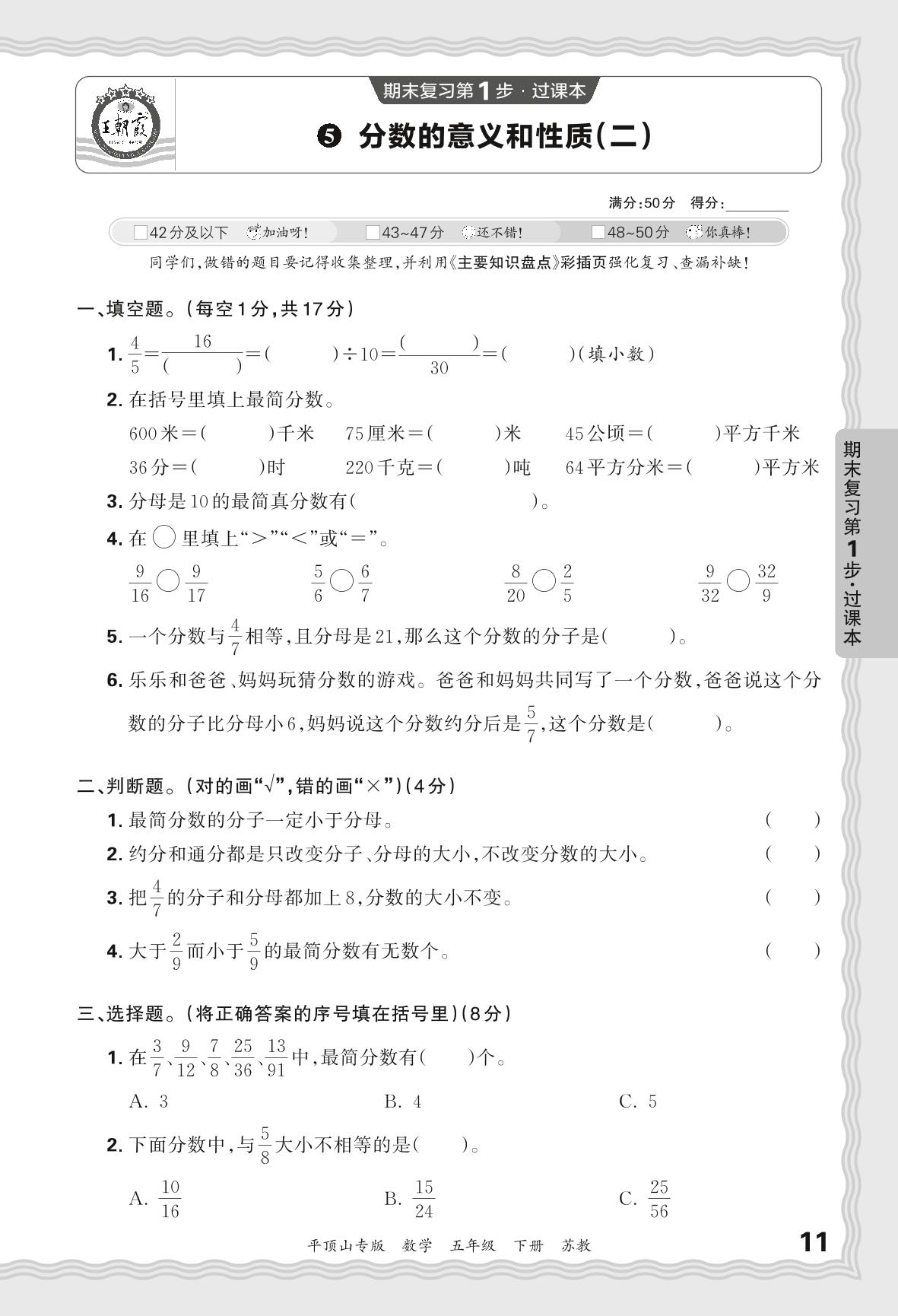 2024春下册五年级数学苏教版 期末过课本平顶山版·分数的意义和性质(二)【5】