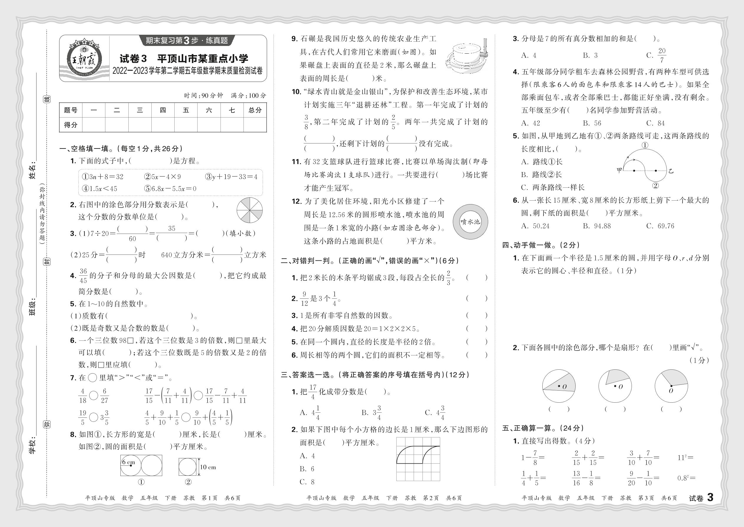 河南省平顶山市某重点小学2022-2023学年第二学期五年级数学期末质量检测试卷(苏教版)【3】