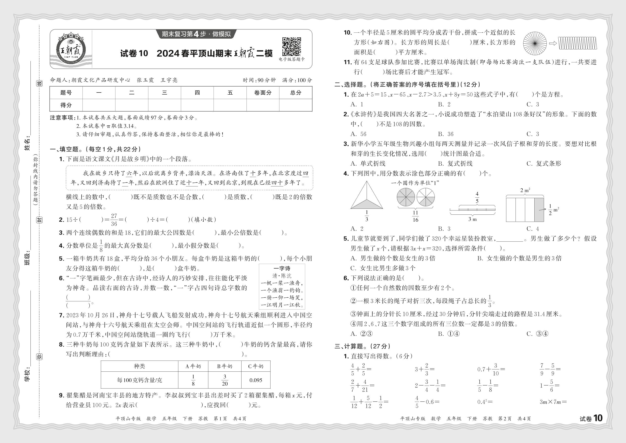 2024春下册五年级数学苏教版 河南平顶山期末王朝霞二模【10】