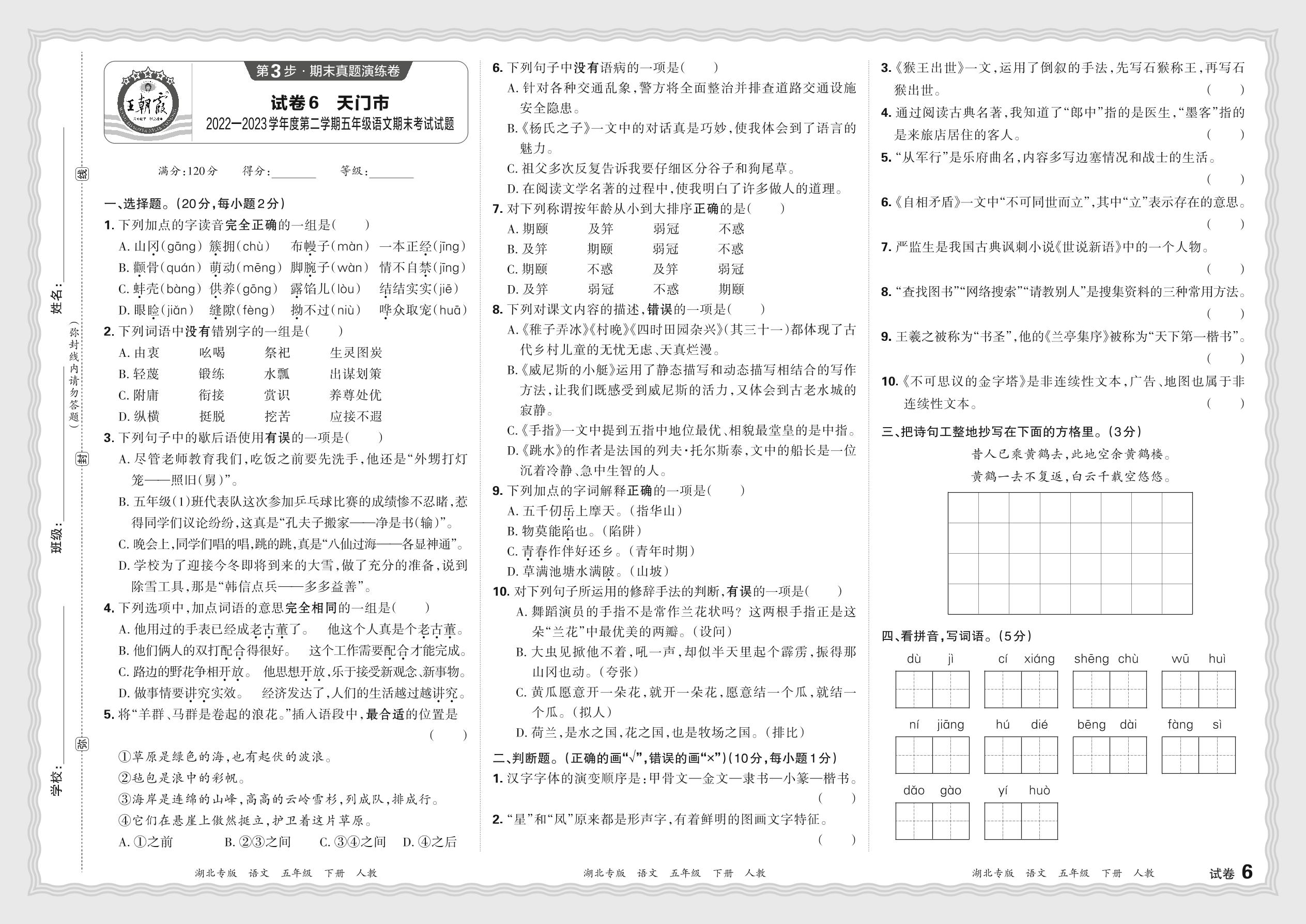 湖北省天门市2022—2023学年度第二学期五年级语文期末考试试题(人教版)【6】