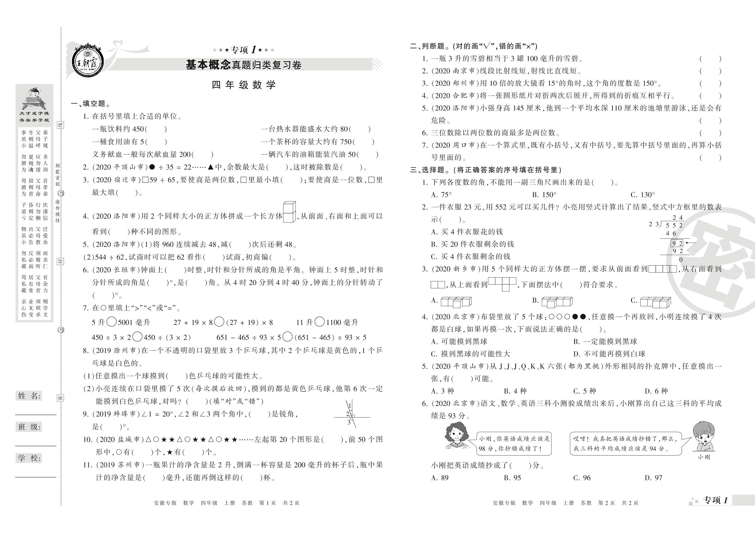 王朝霞期末专项卷——基本概念、计算真题归类复习四年级上册数学(苏教版)