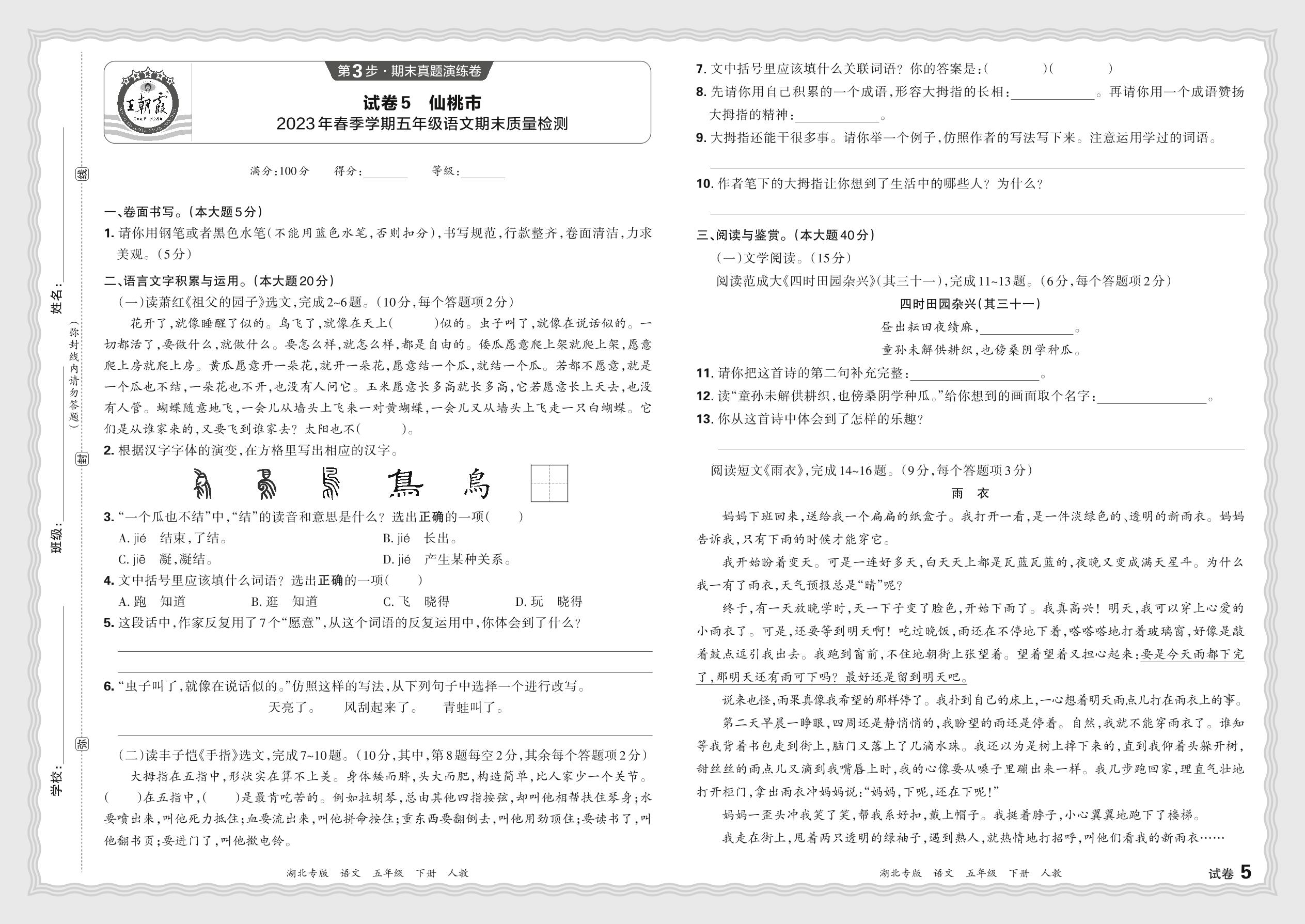 湖北省仙桃市2023年春季学期五年级语文期末质量检测(人教版)【5】