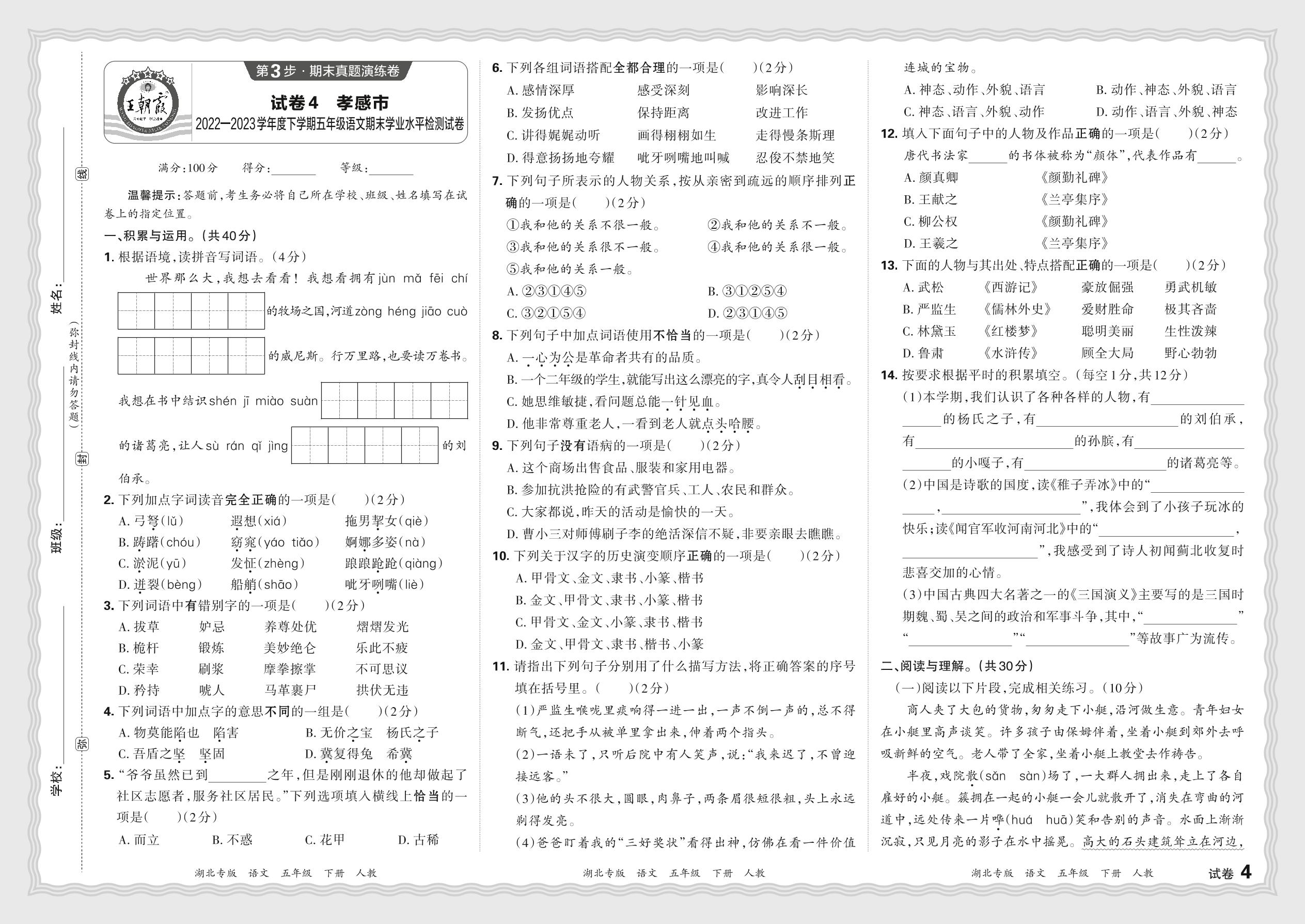 湖北省孝感市2022—2023学年度下学期五年级语文期末学业水平检测试卷(人教版)【4】