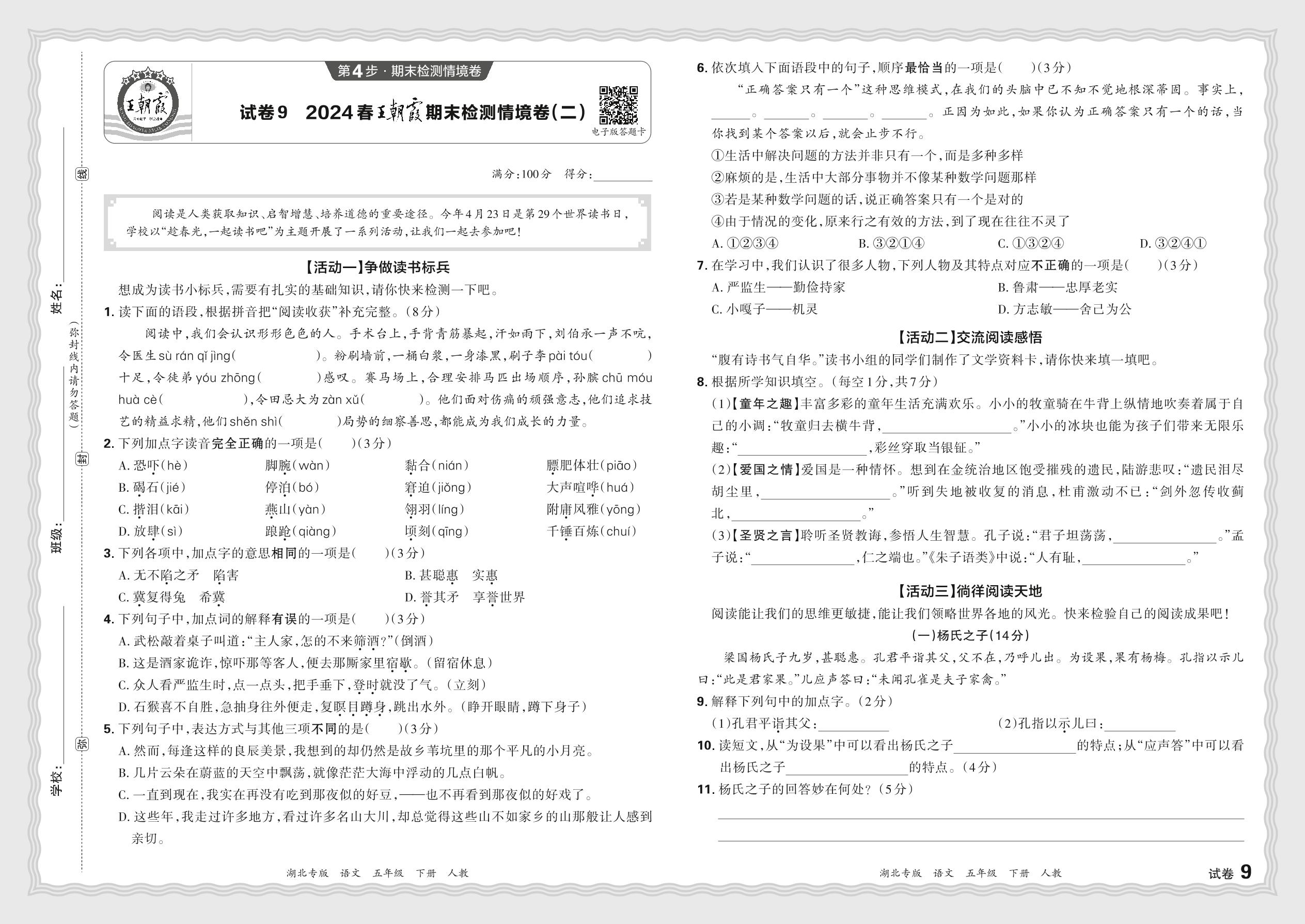 2024春下册五年级语文人教版 湖北王朝霞期末检测情境卷(二)