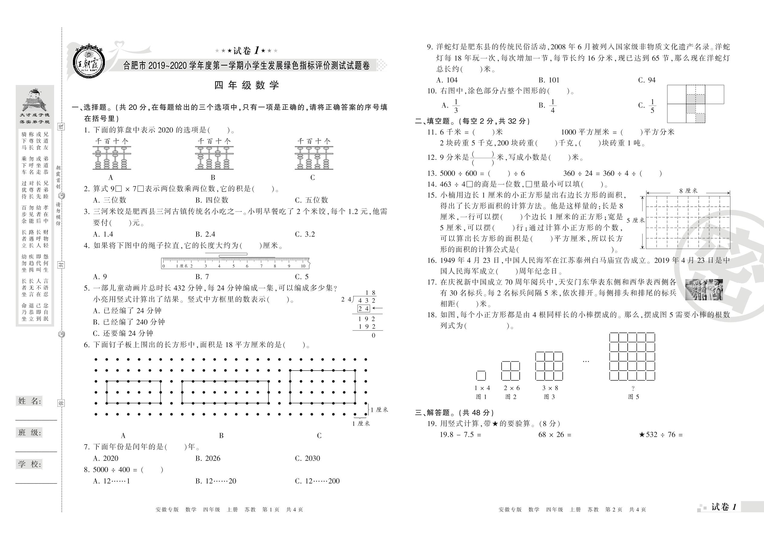 2019-2020学年第一学期合肥市四年级数学试卷(苏教版)【1】