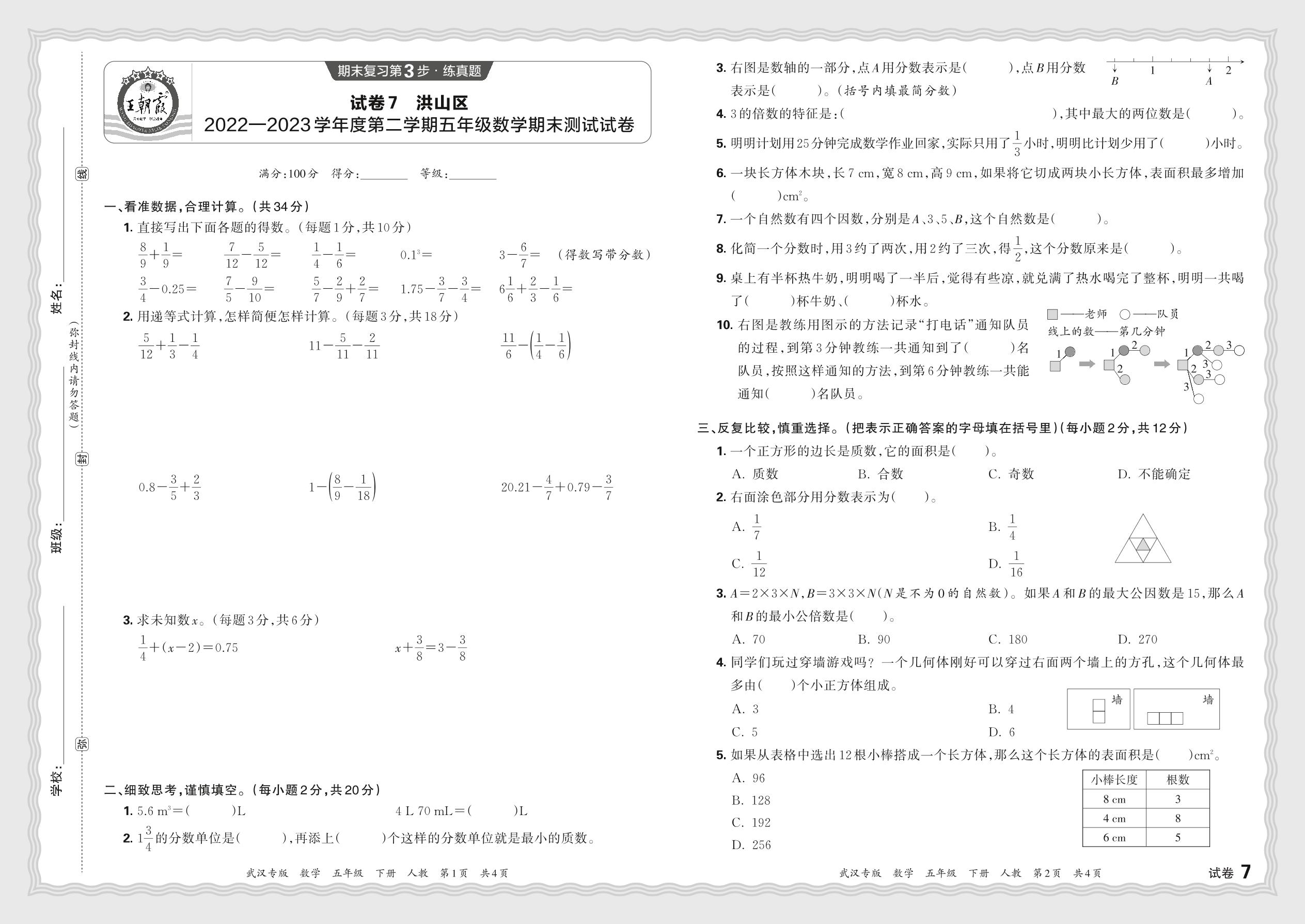 湖北省武汉市洪山区2022—2023学年度第二学期五年级数学期末测试试卷(人教版)【7】